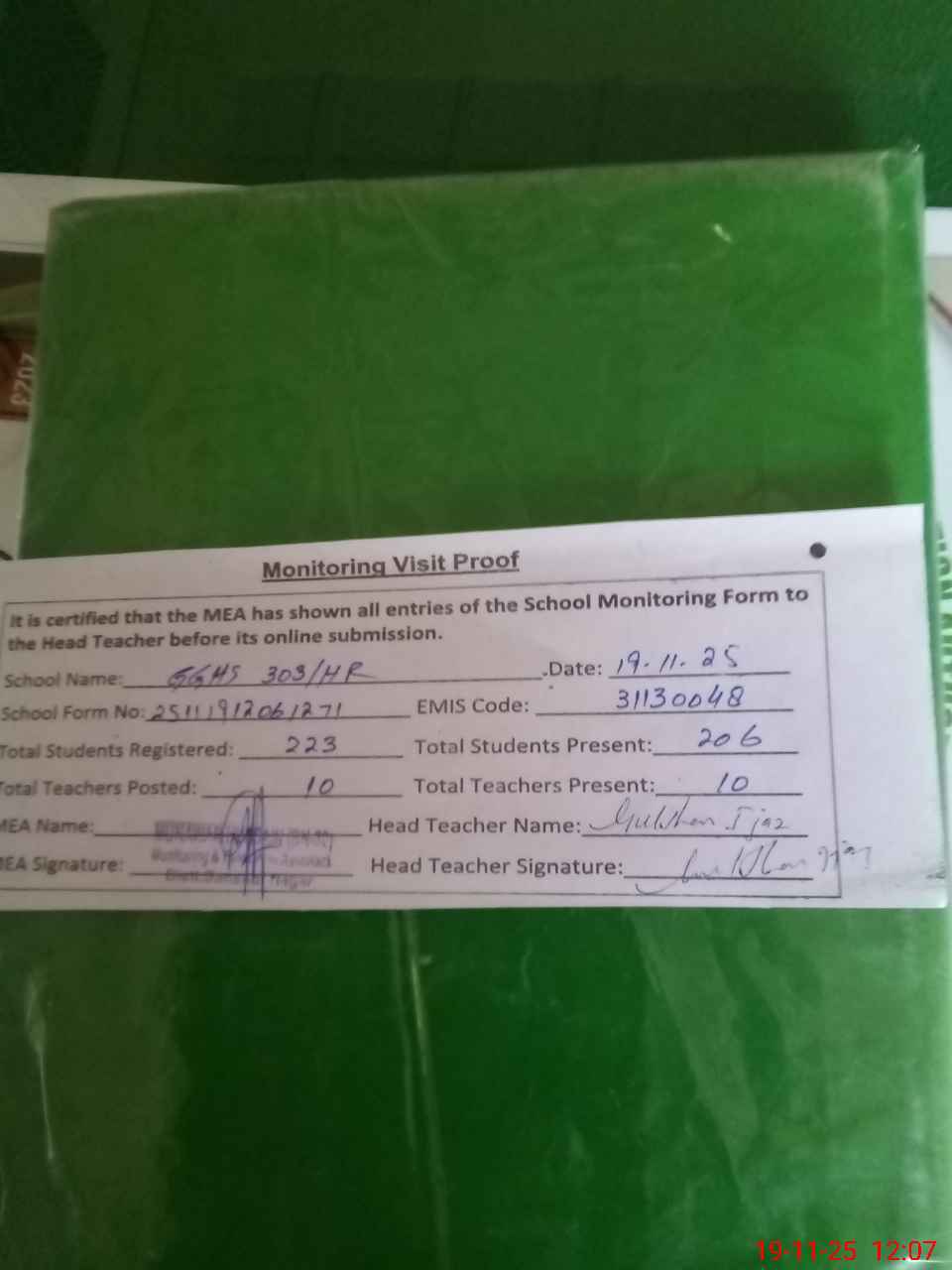 | Attendance Register | Head Teacher | MEA with School | Visit Proof |