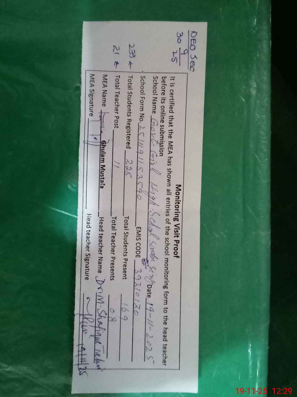 | Remarks (Use Separate Page if Required): NSB record not provided to mentioned in the column therefore the column lying blank etc Last visit by DEO Secondary on 30 September 2025 | |||||