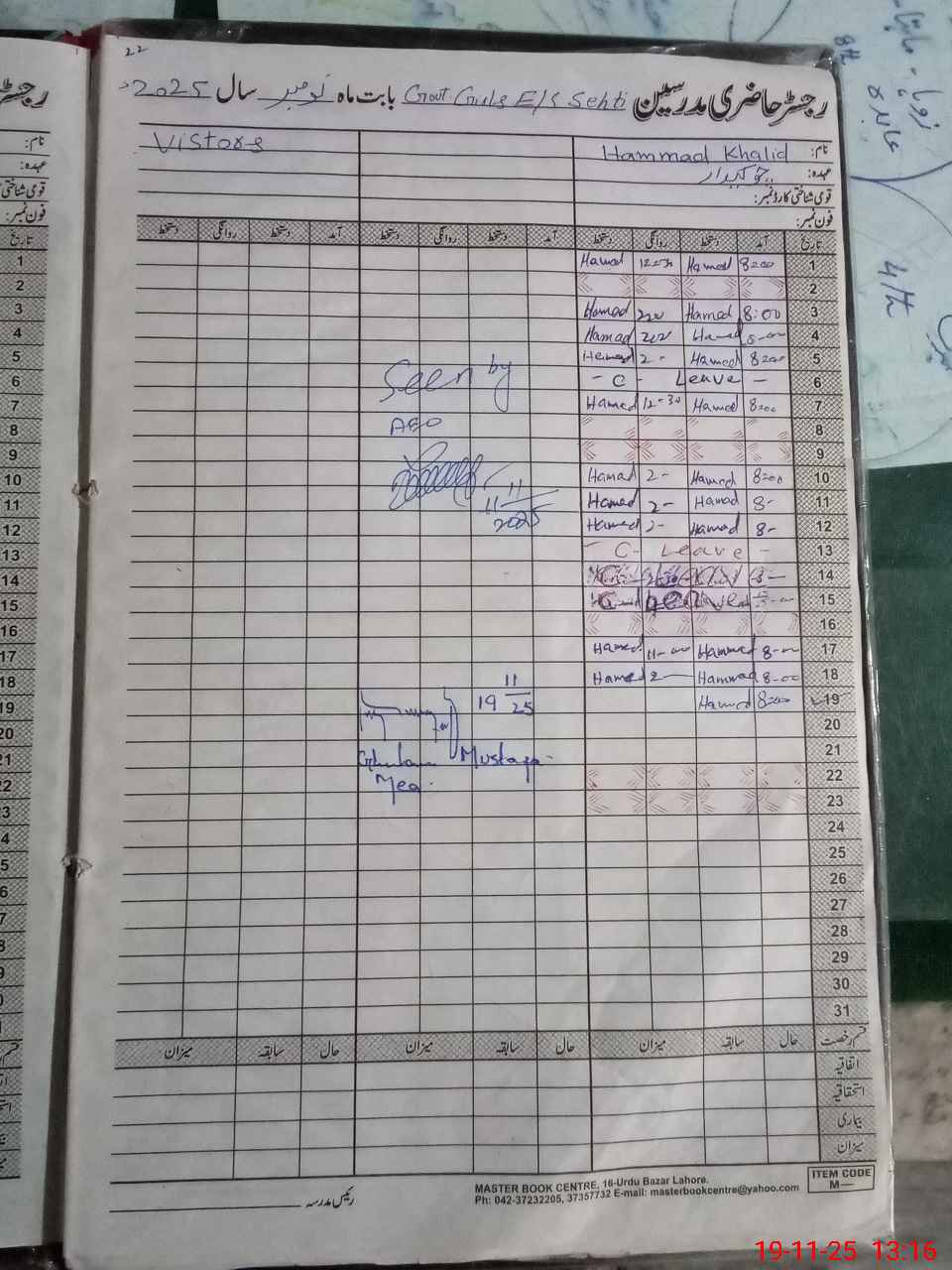 | CNIC | Full Name | Designation | R/C | Absence During Last Calender Month |