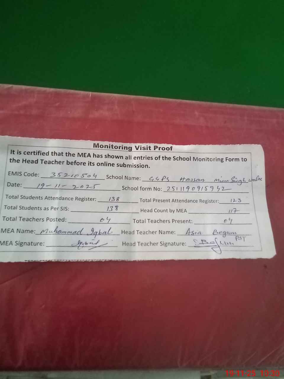 | EMIS Code: 35210504 | Name of School: GGPS HASSAN ABAD (Mian Singh Wala) | |||