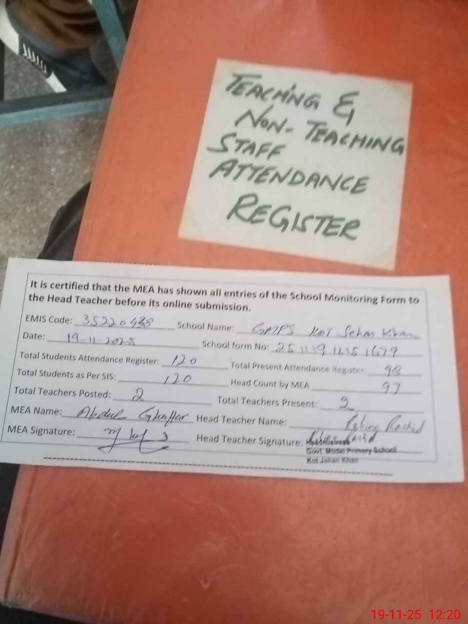 | EMIS Code: 35220438 | Name of School: GMPS KOT JAHAN KHAN | |||