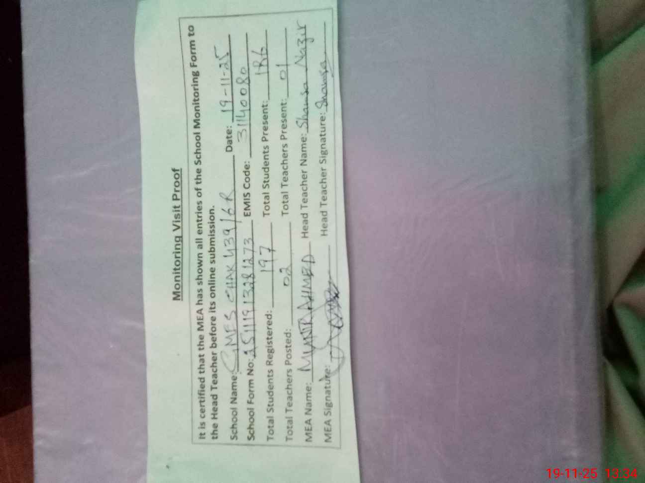 | Attendance Register | Head Teacher | MEA with School | Visit Proof |