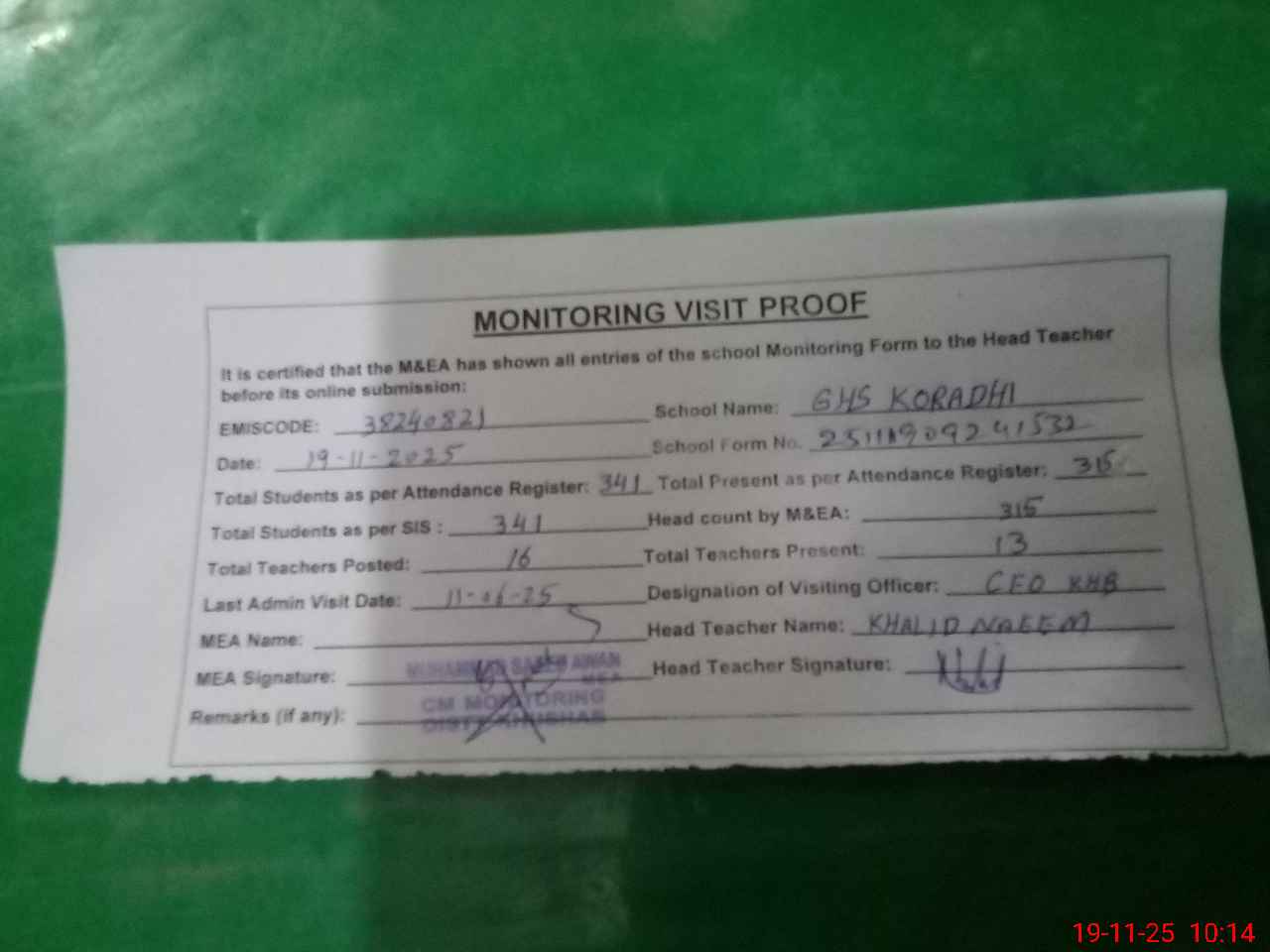 | Certified that this School was Inspected by the Undersigned MEA/DMO Today and the Information Stated Above is as Per Record. | |||||
