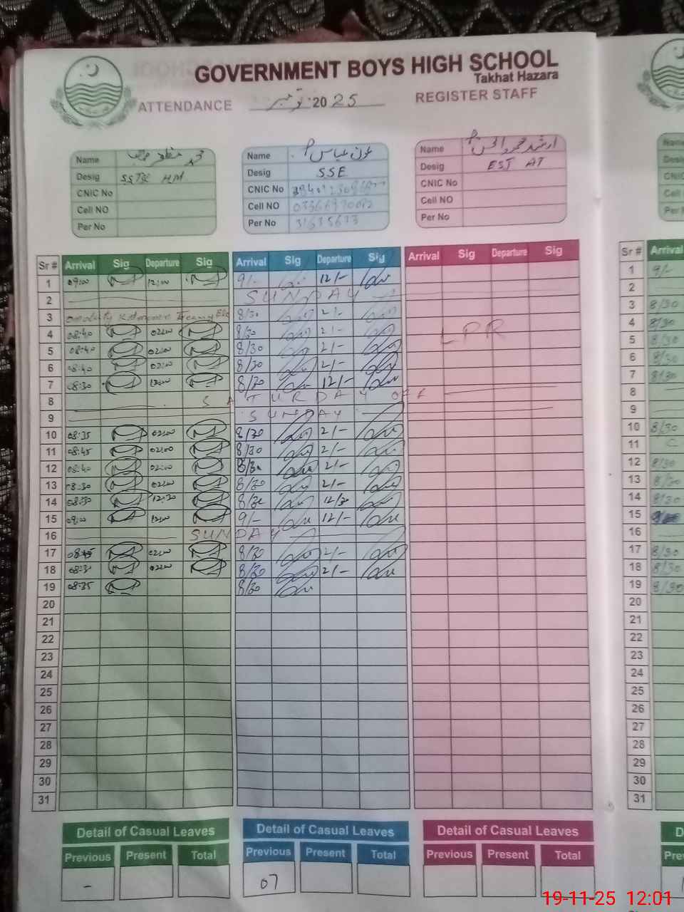 | CNIC | Full Name | Designation | R/C | Absence during last cal. month |