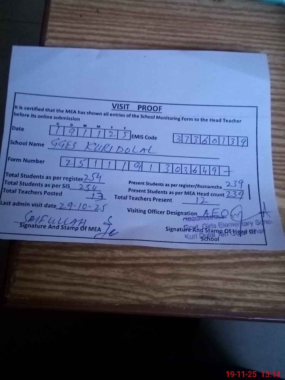 | Attendance Register | Head Teacher | MEA with School | Visit Proof |
