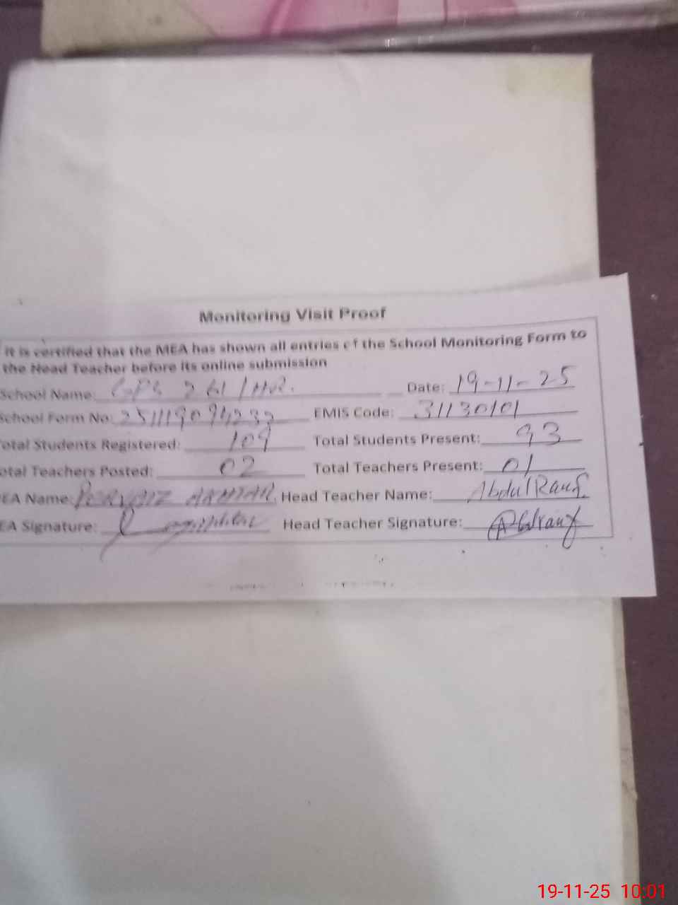 | Attendance Register | Head Teacher | MEA with School | Visit Proof |