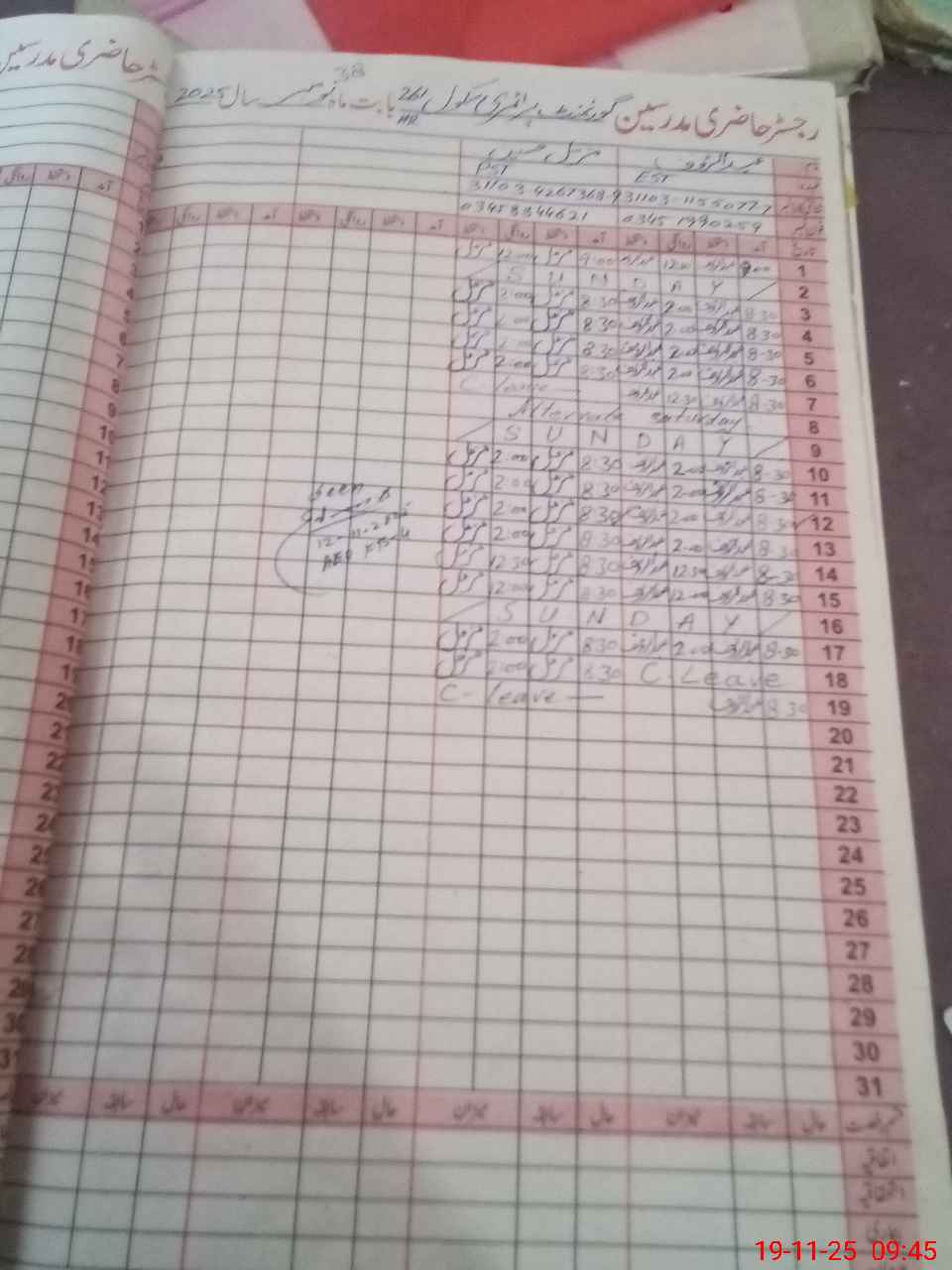 | CNIC | Full Name | Designation | R/C | Absence During Last Calender Month |