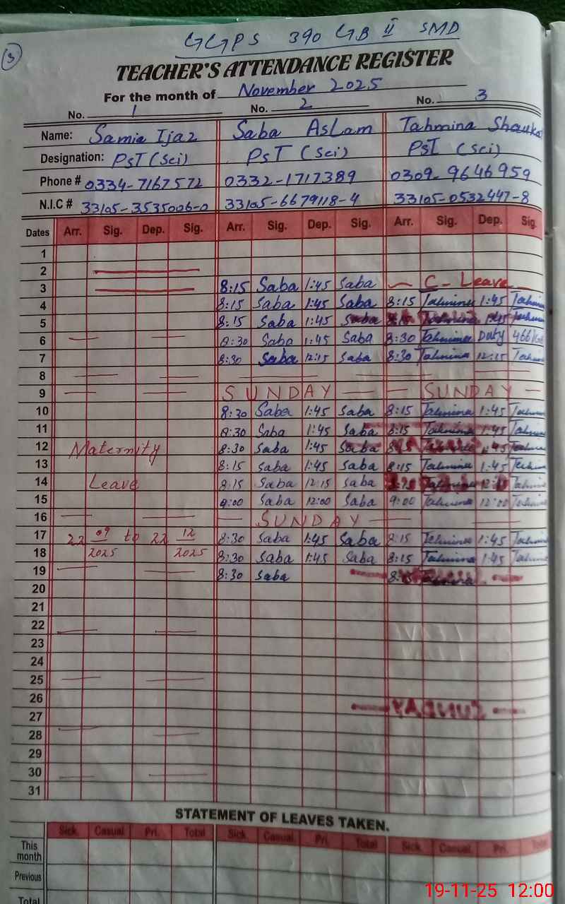 | CNIC | Full Name | Designation | R/C | Absence During Last Calender Month |