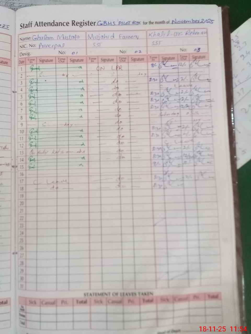 | CNIC | Full Name | Designation | R/C | Absence During Last Calender Month |