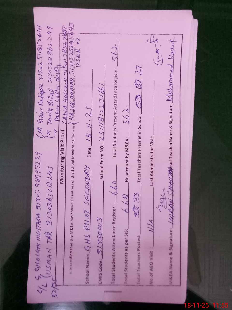 | Attendance Register | Head Teacher | MEA with School | Visit Proof |