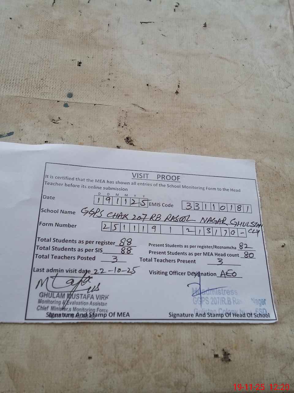 | EMIS Code: 33110181 | Name of School: GGPS CHAK 207 RB RASOOL NAGAR GHULSTAN COLONY | |||