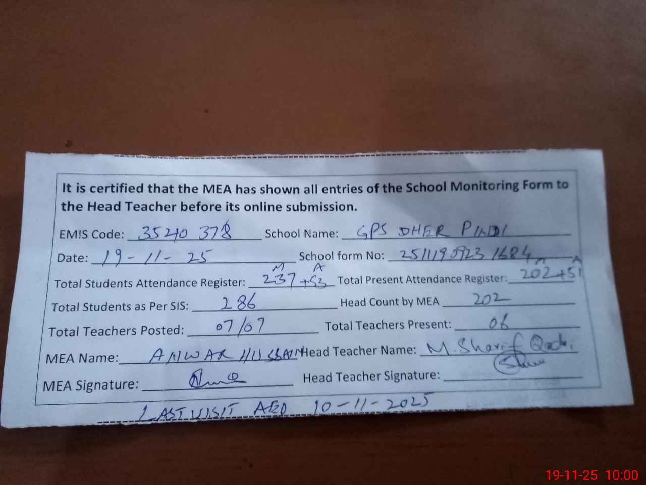 | Attendance Register | Head Teacher | MEA with School | Visit Proof |