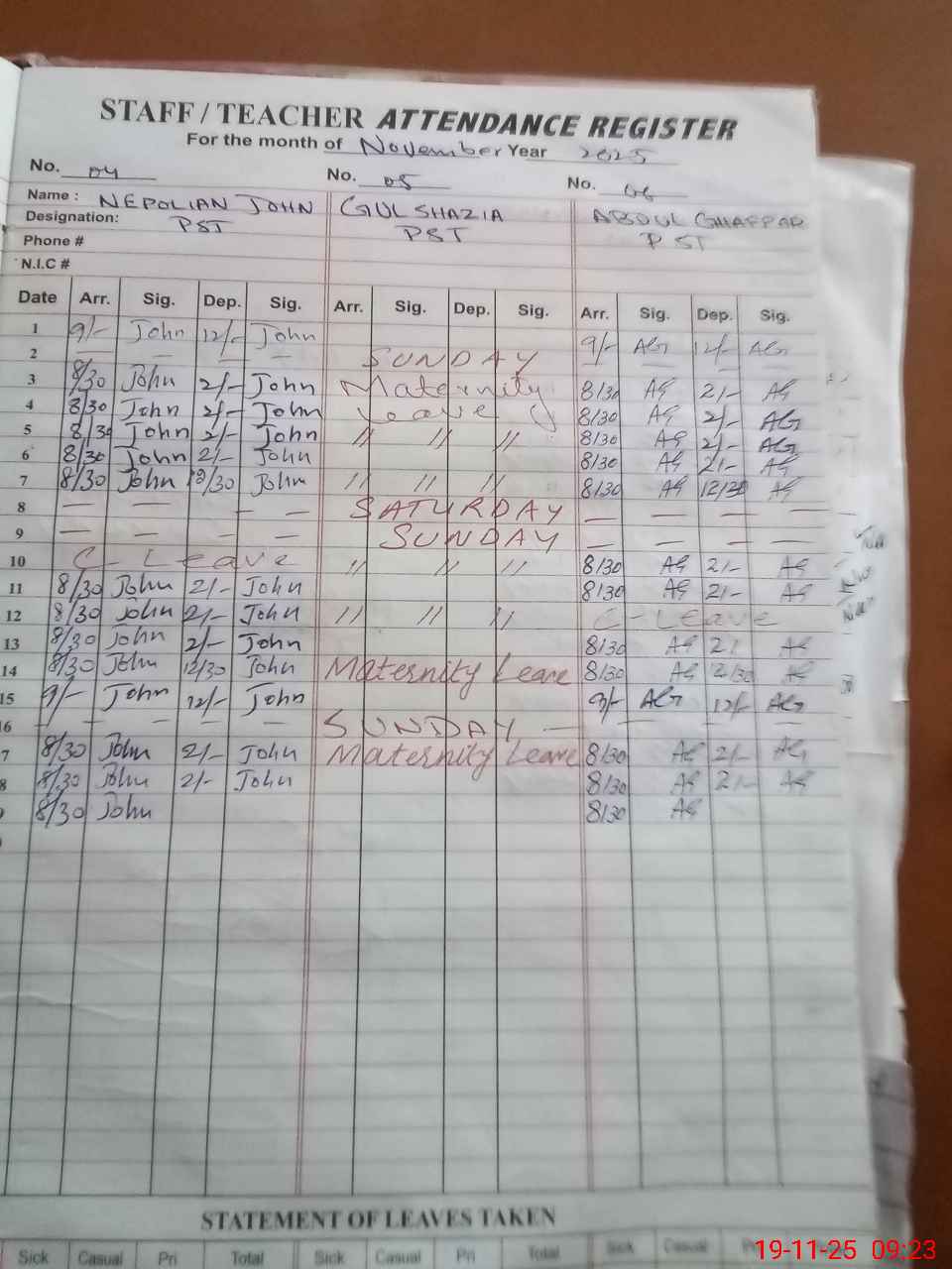 | Leave | Duty | Absent | Maternity | Medical | Ex- Pak |