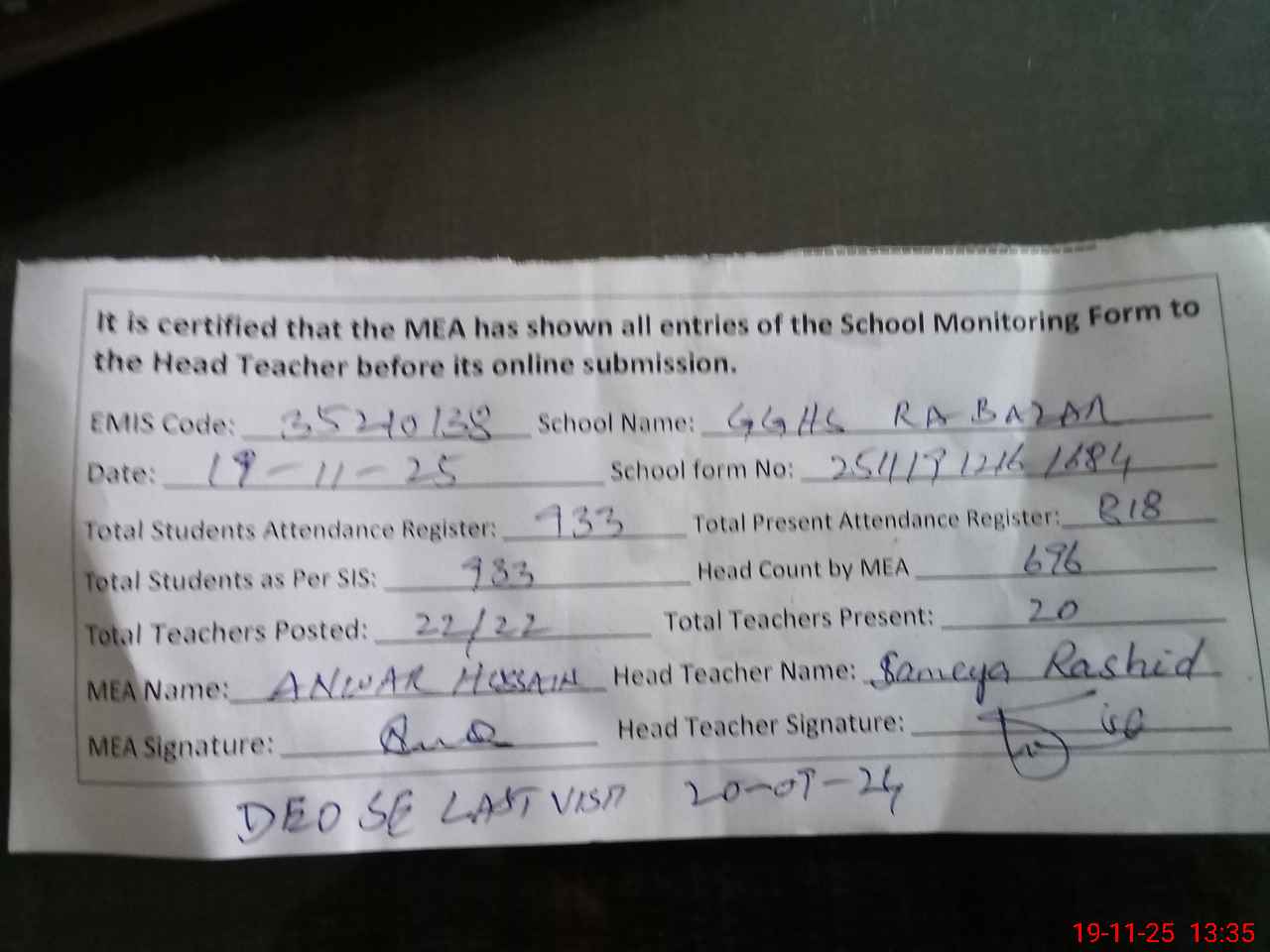 | Remarks (Use Separate Page if Required): Nafisa Liaqat EST as per attendance register on earned leave wef 10 November 2025 but sanctioned leave not available so Mark absent Adil Naimat Sweaper attendance register column blank physically not available so Mark absent Last visit DEOSE 20 September 2024 35210138 | |||||