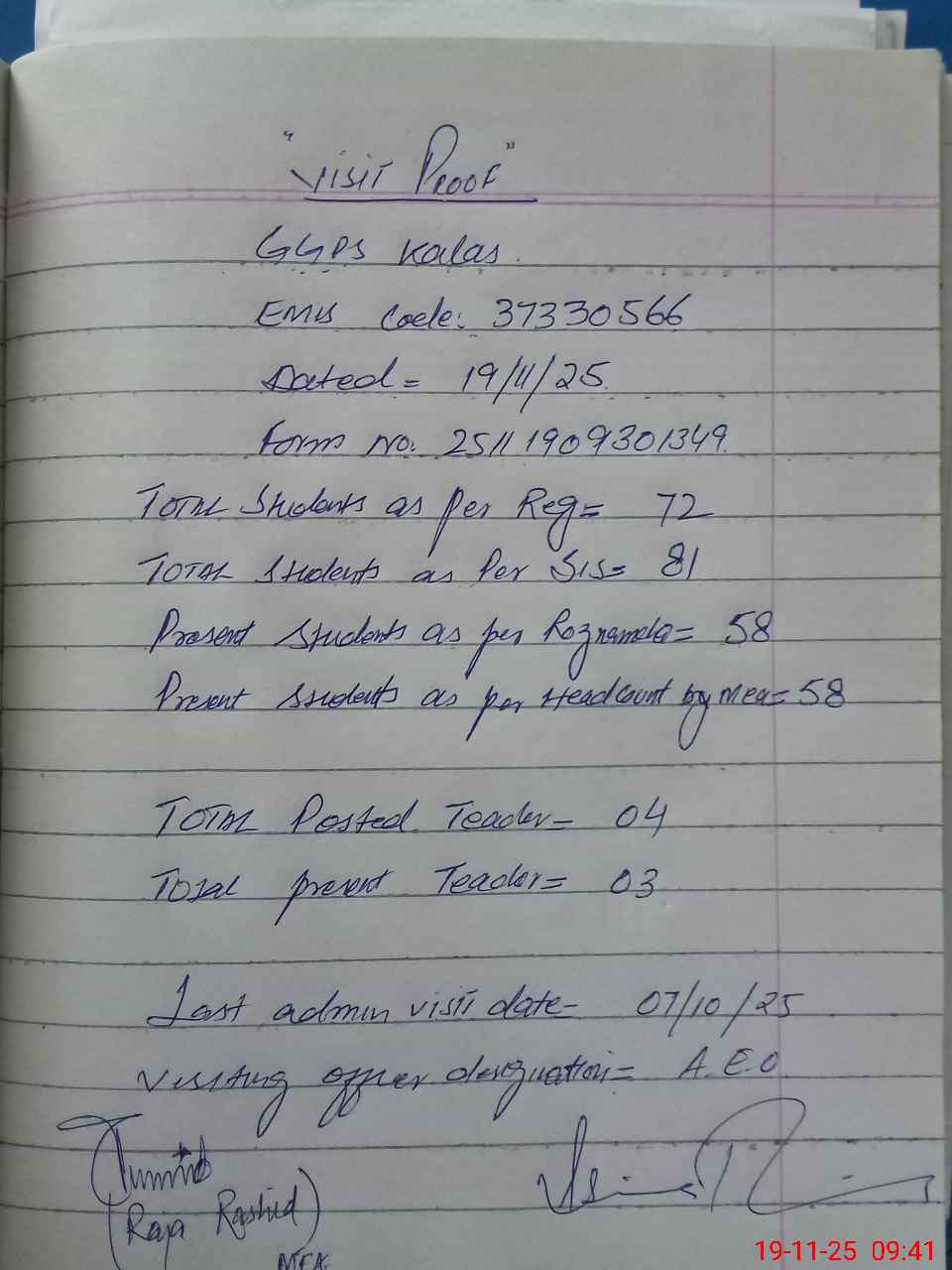 | Attendance Register | Head Teacher | MEA with School | Visit Proof |