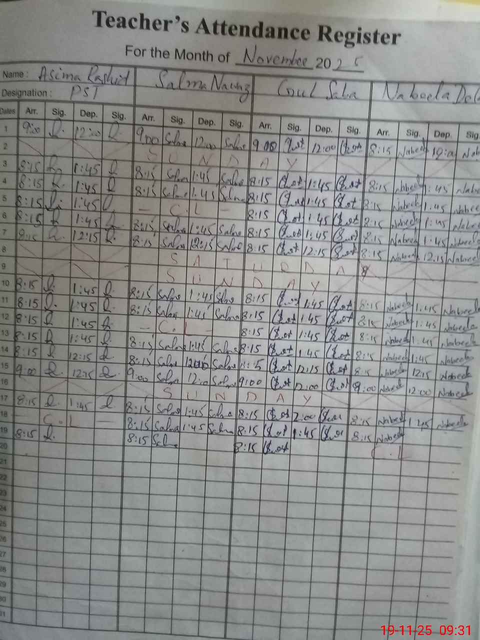 | CNIC | Full Name | Designation | R/C | Absence During Last Calender Month |