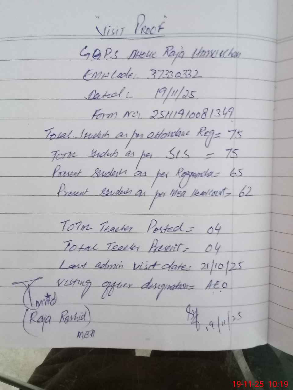 | Attendance Register | Head Teacher | MEA with School | Visit Proof |