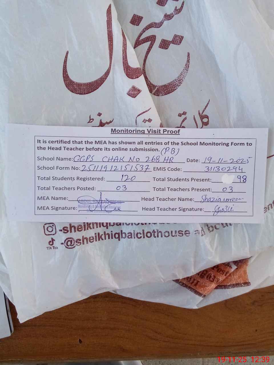 | EMIS Code: 31130294 | Name of School: GGPS CHAK NO 268 HR PUL BASTI | |||