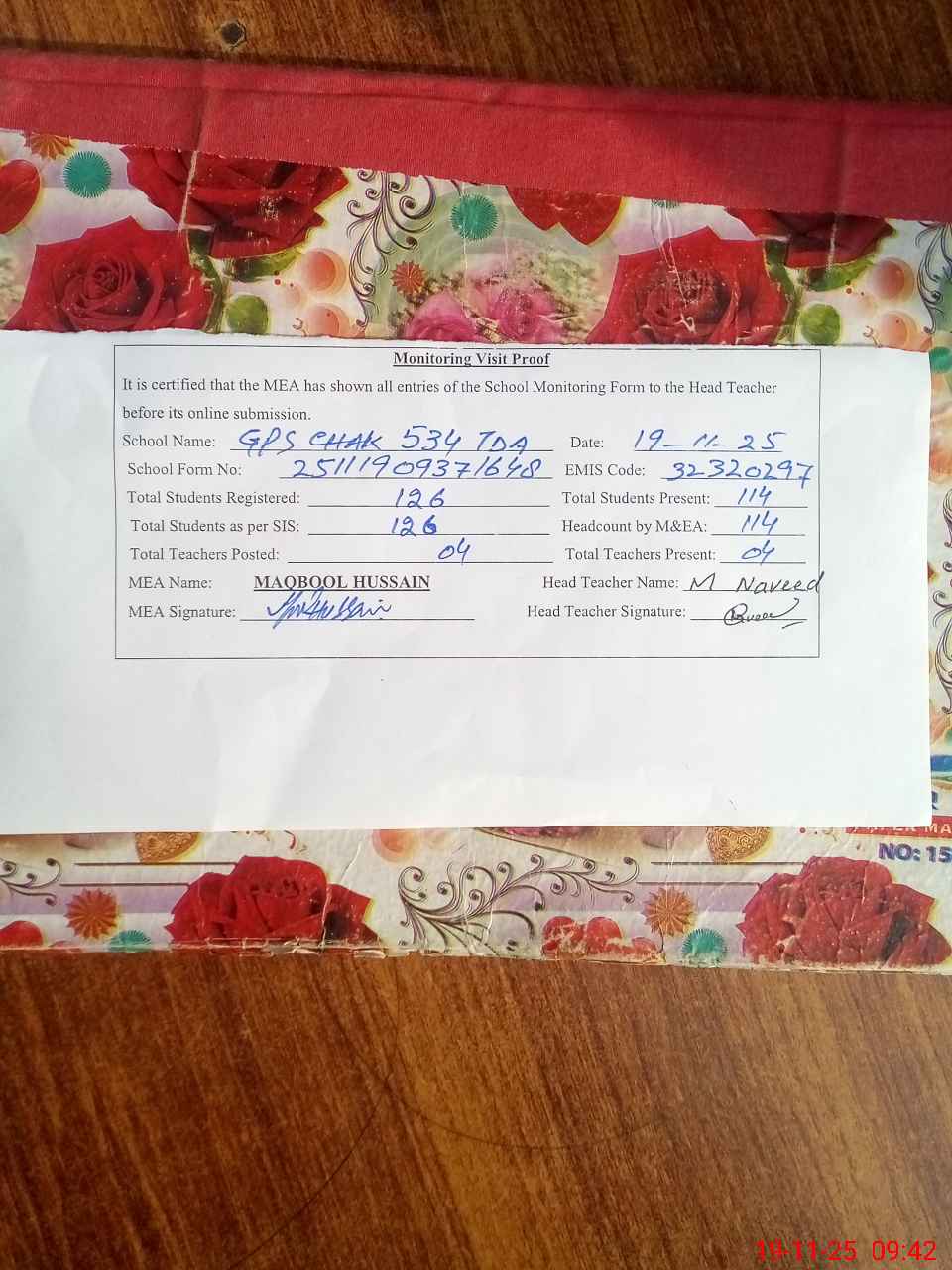| Attendance Register | Head Teacher | MEA with School | Visit Proof |