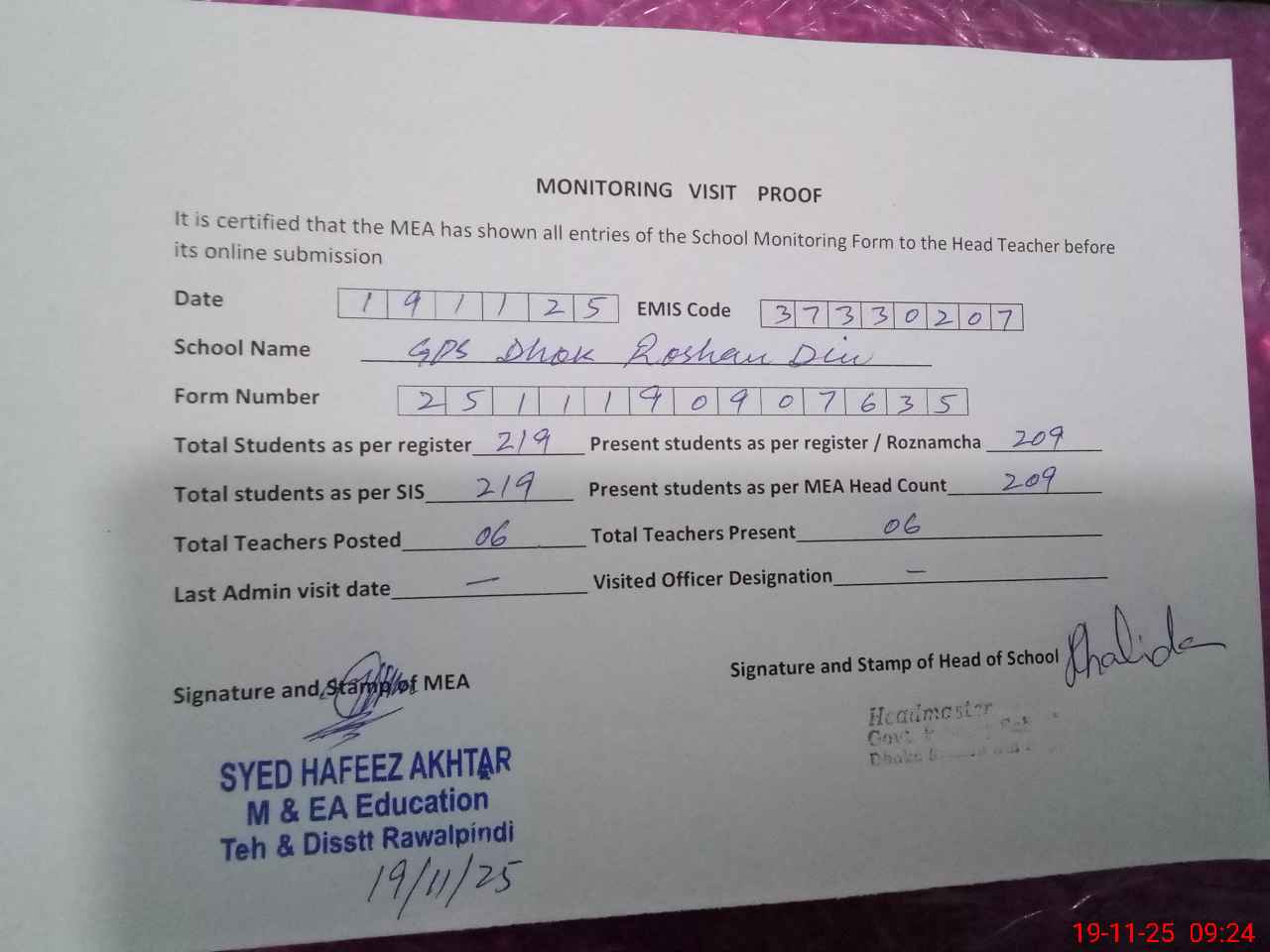 | Certified that this School was Inspected by the Undersigned MEA/DMO Today and the Information Stated Above is as Per Record. | |||||