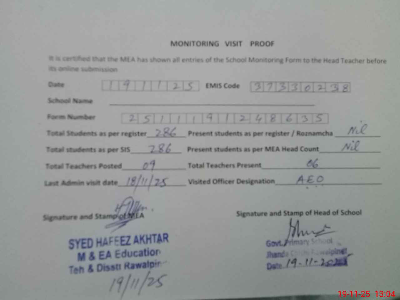 | Remarks (Use Separate Page if Required): NSB record not updated in pmiu and sis both apps No students are present in school today due to WhatsApp message regarding students will be on off | |||||