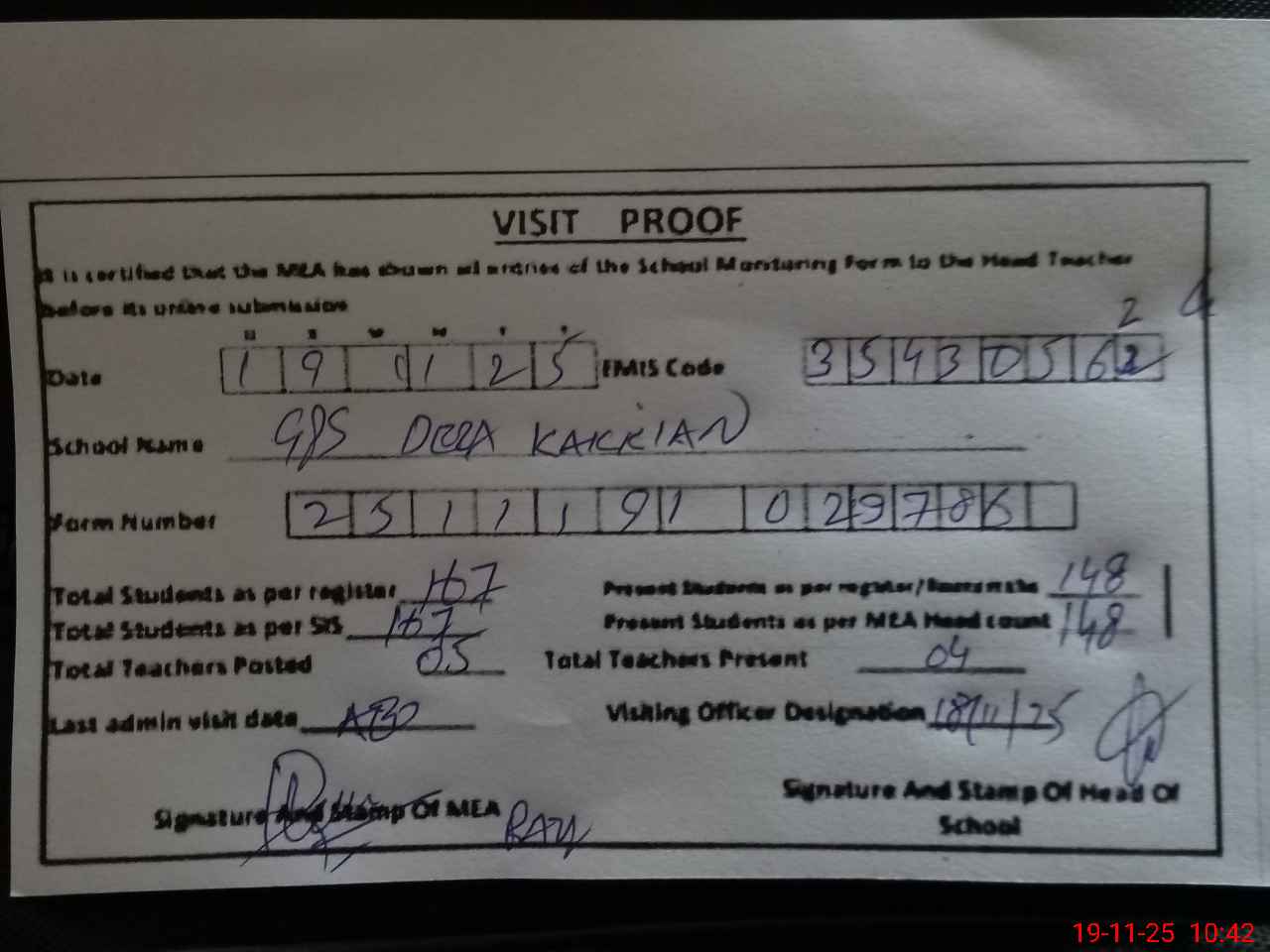 | Attendance Register | Head Teacher | MEA with School | Visit Proof |