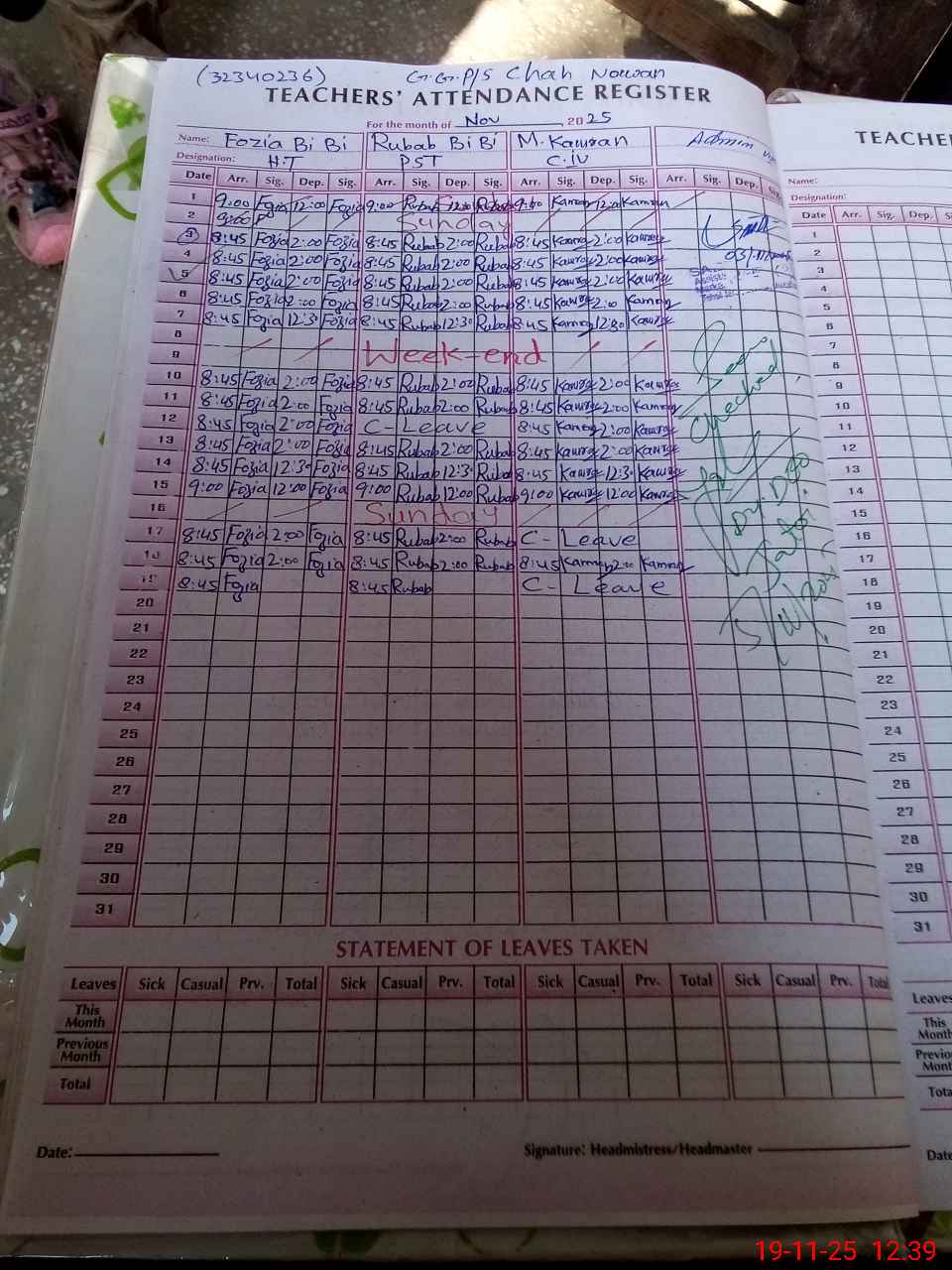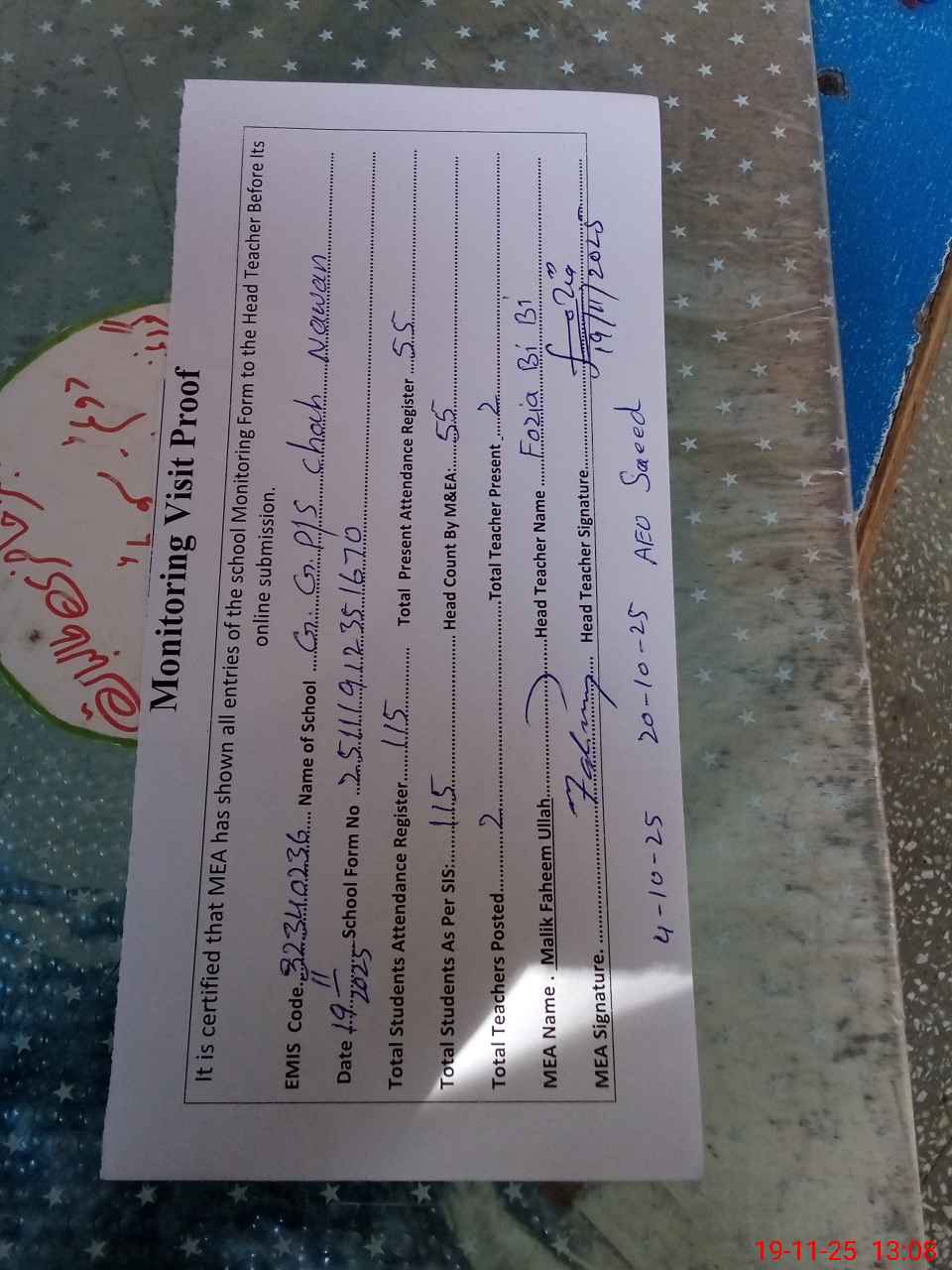 | Attendance Register | Head Teacher | MEA with School | Visit Proof |