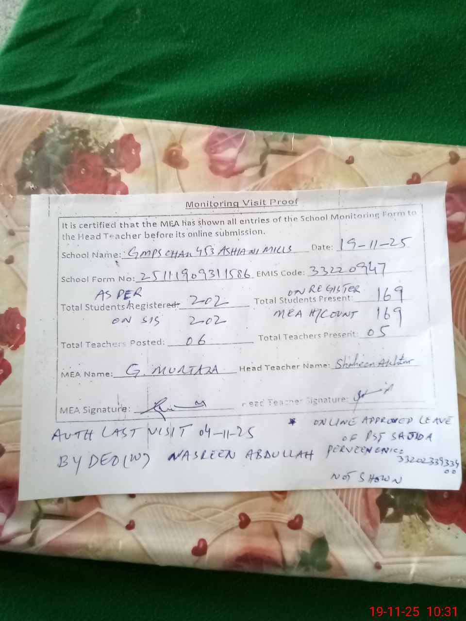 | Attendance Register | Head Teacher | MEA with School | Visit Proof |