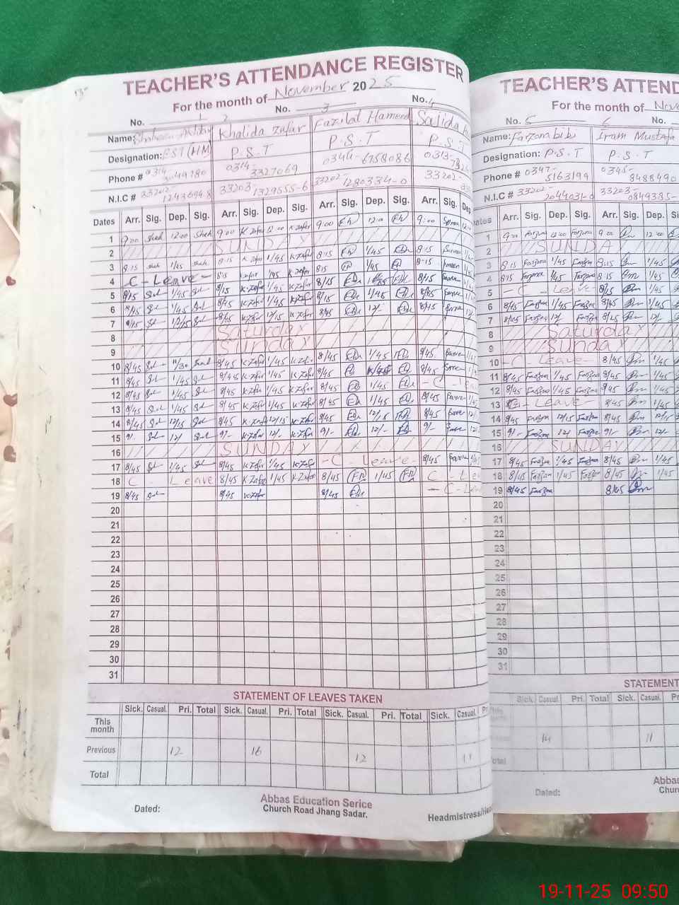 | CNIC | Full Name | Designation | R/C | Absence During Last Calender Month |