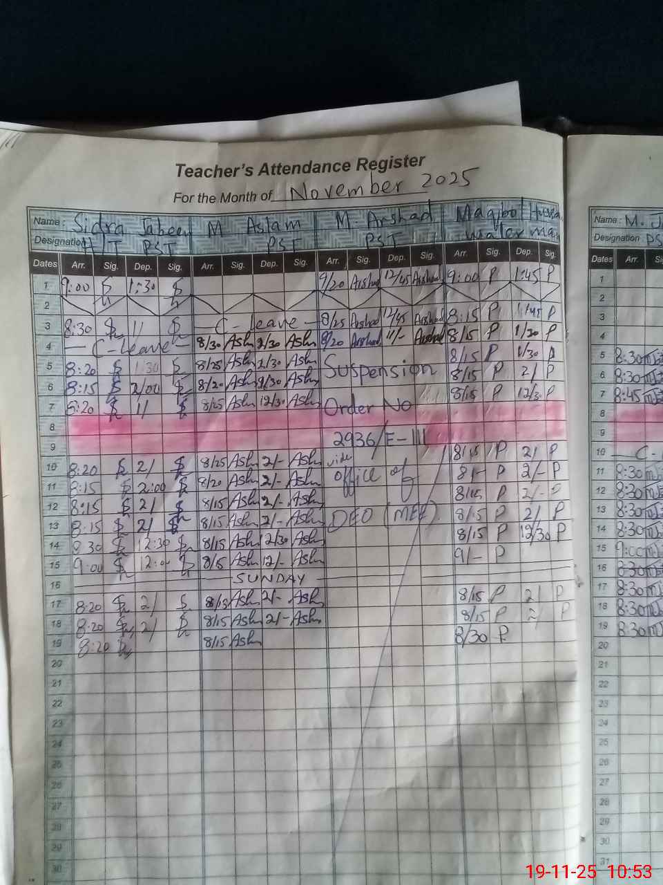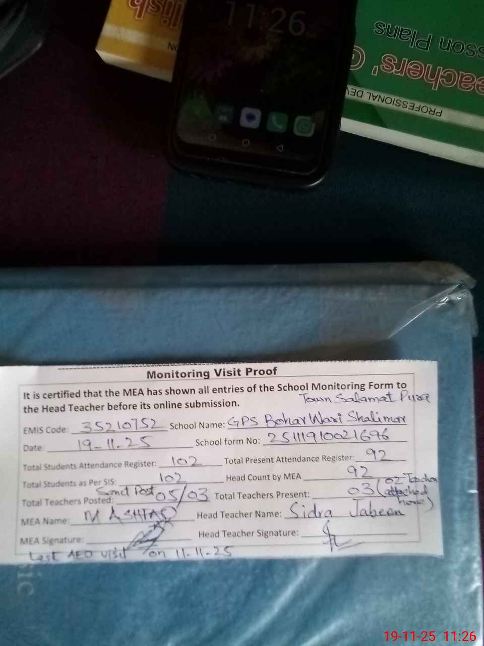 | Remarks (Use Separate Page if Required): PST Muhammad Arshad suspended on 04 November 25 Last visit of AEO Gulbaz on 11 November 25 PST Muhammad Jameel and PST Shahid Atta Muhammad attached here and both present today Teachers Sanctioned Post 05 Filled 03 35210752 | |||||