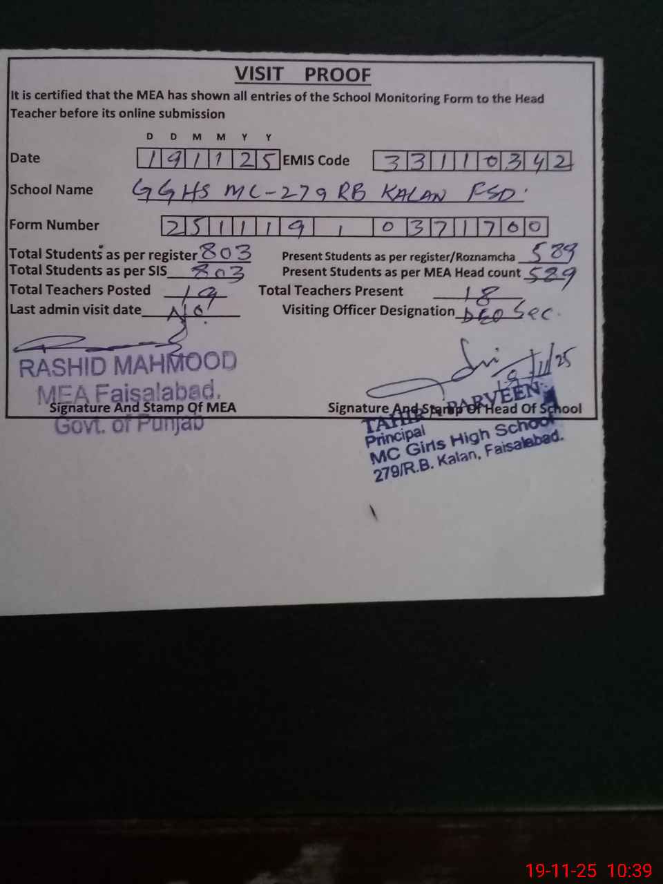 | Certified that this School was Inspected by the Undersigned MEA/DMO Today and the Information Stated Above is as Per Record. | |||||