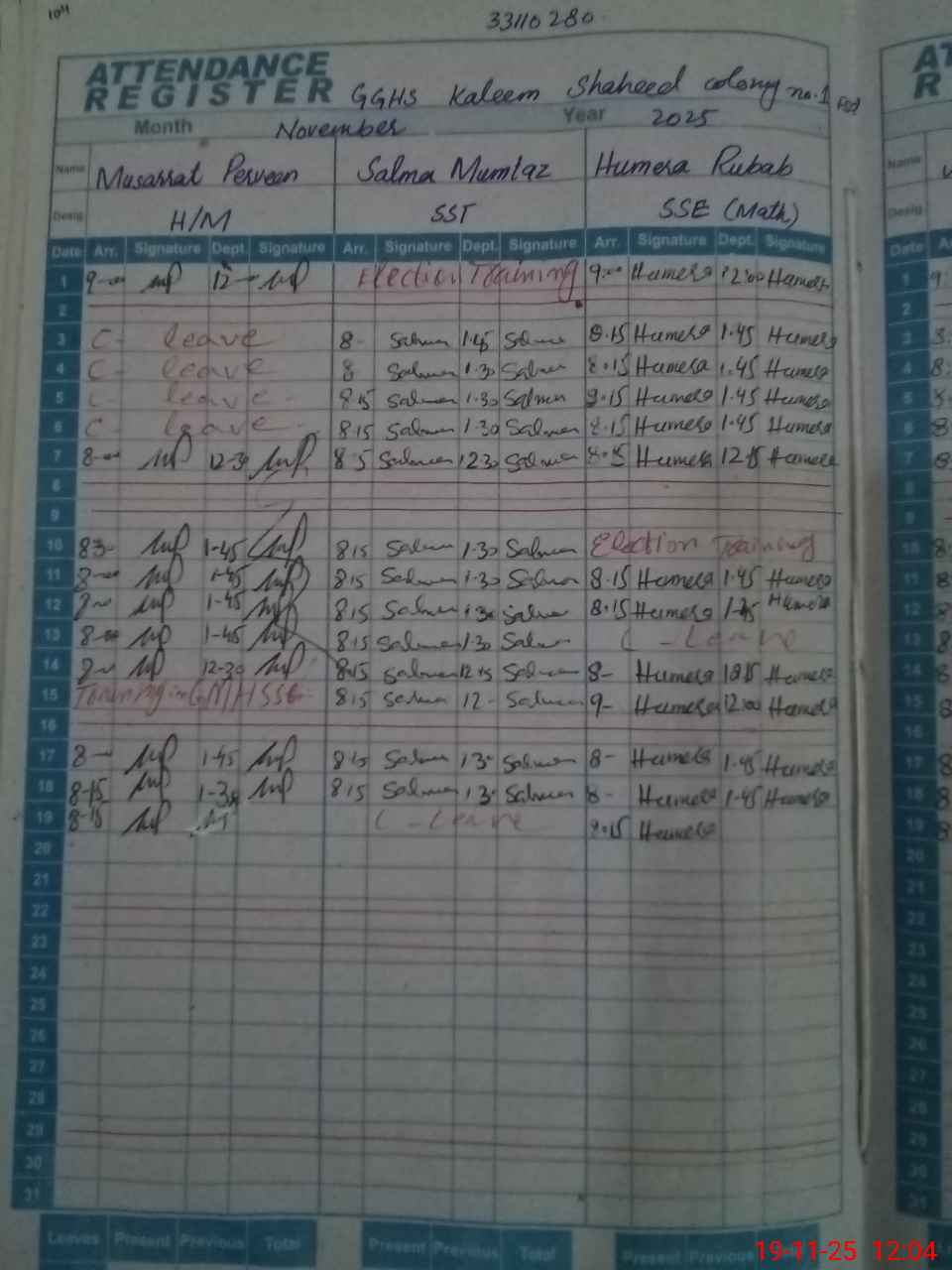 | Leave | Duty | Absent | Maternity | Medical | Ex- Pak |