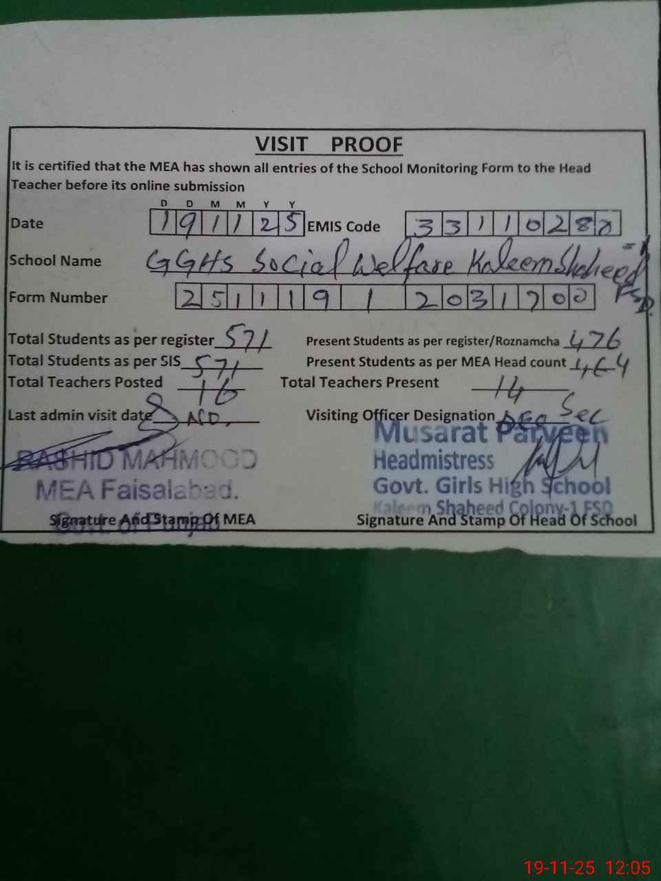 | Certified that this School was Inspected by the Undersigned MEA/DMO Today and the Information Stated Above is as Per Record. | |||||