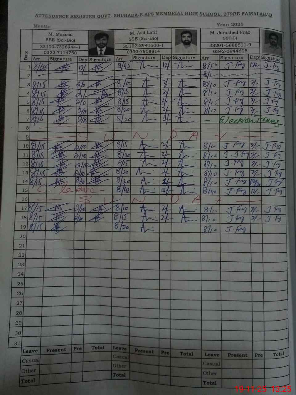 | CNIC | Full Name | Designation | R/C | Absence during last cal. month |