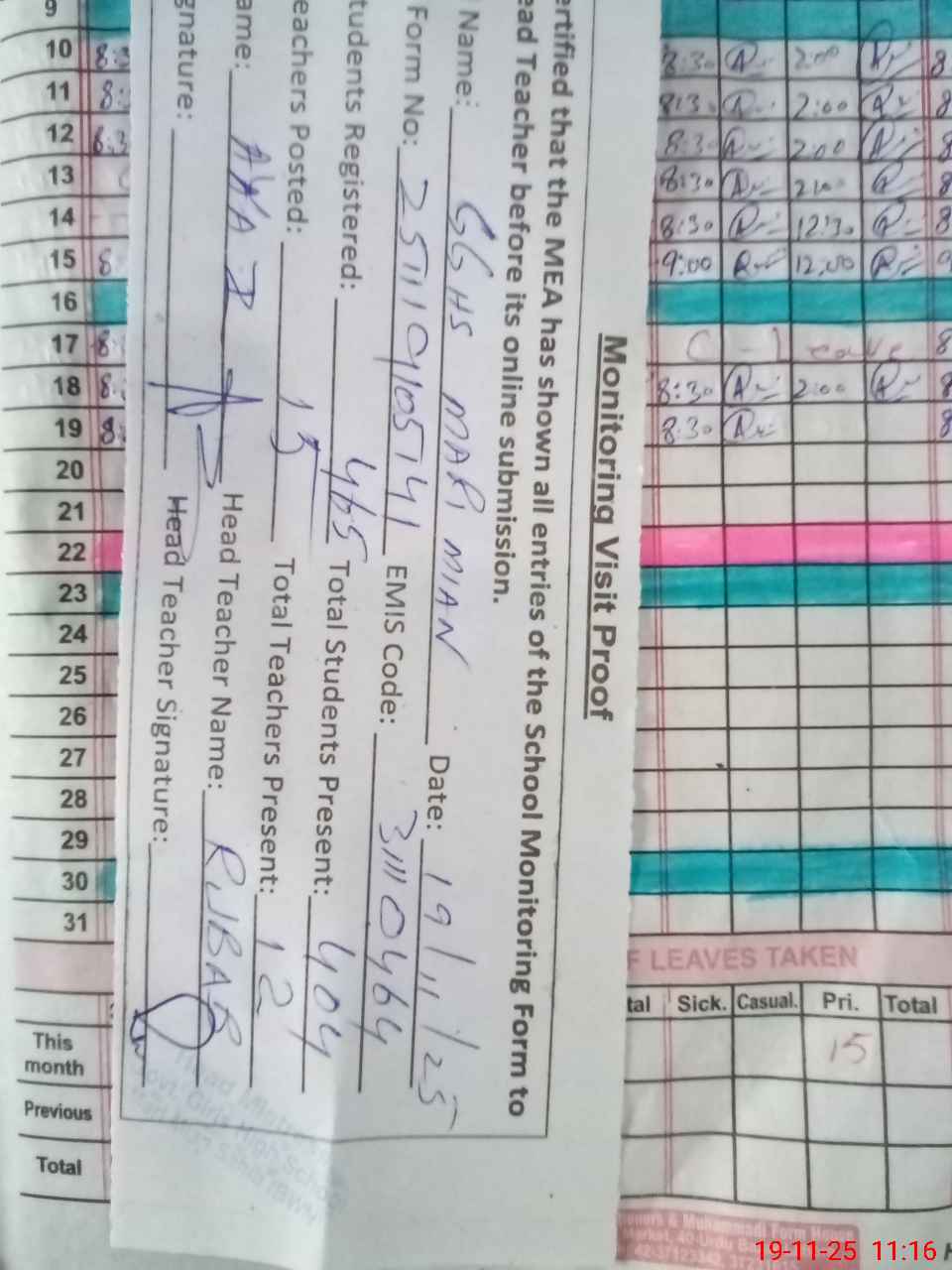 | Attendance Register | Head Teacher | MEA with School | Visit Proof |