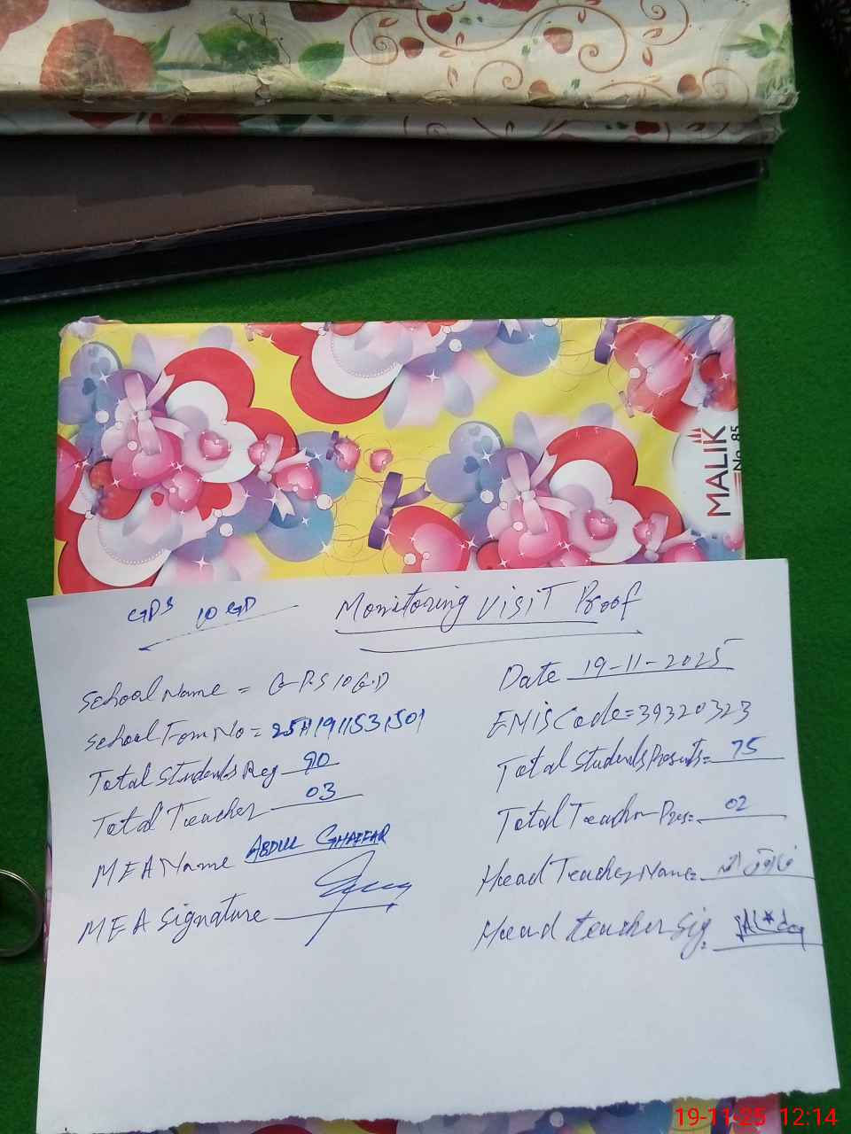 | Attendance Register | Head Teacher | MEA with School | Visit Proof |