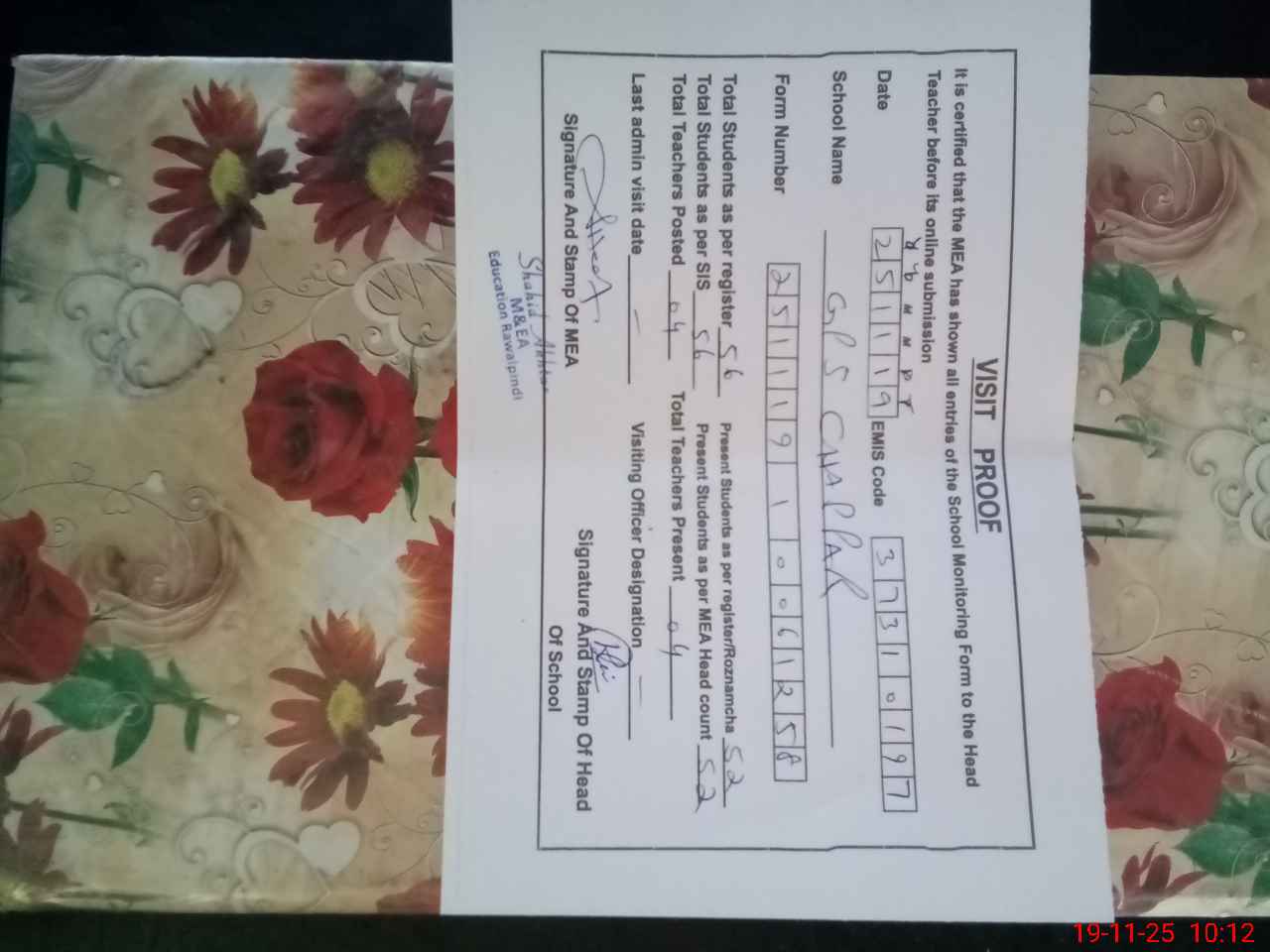 | Attendance Register | Head Teacher | MEA with School | Visit Proof |
