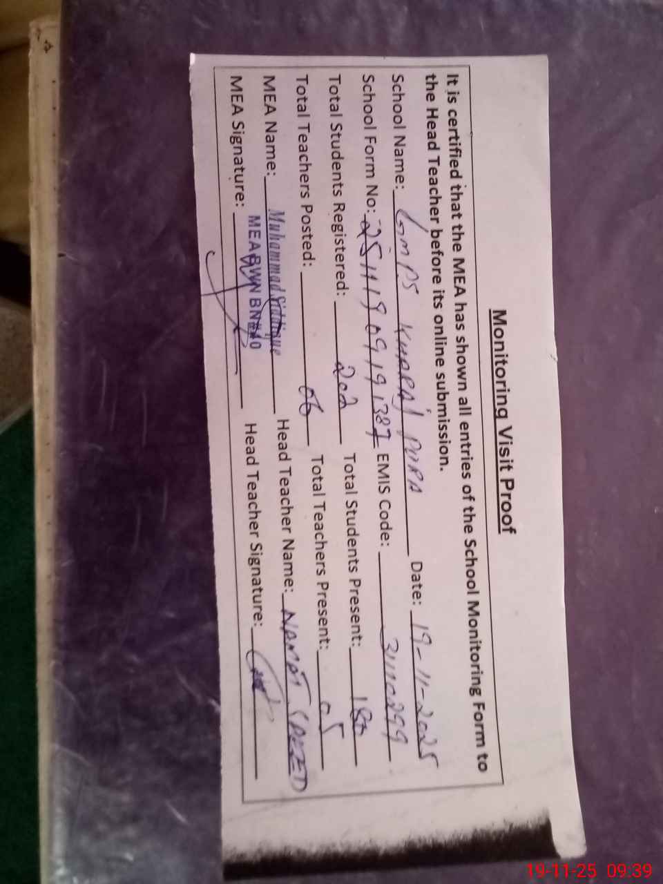 | Attendance Register | Head Teacher | MEA with School | Visit Proof |