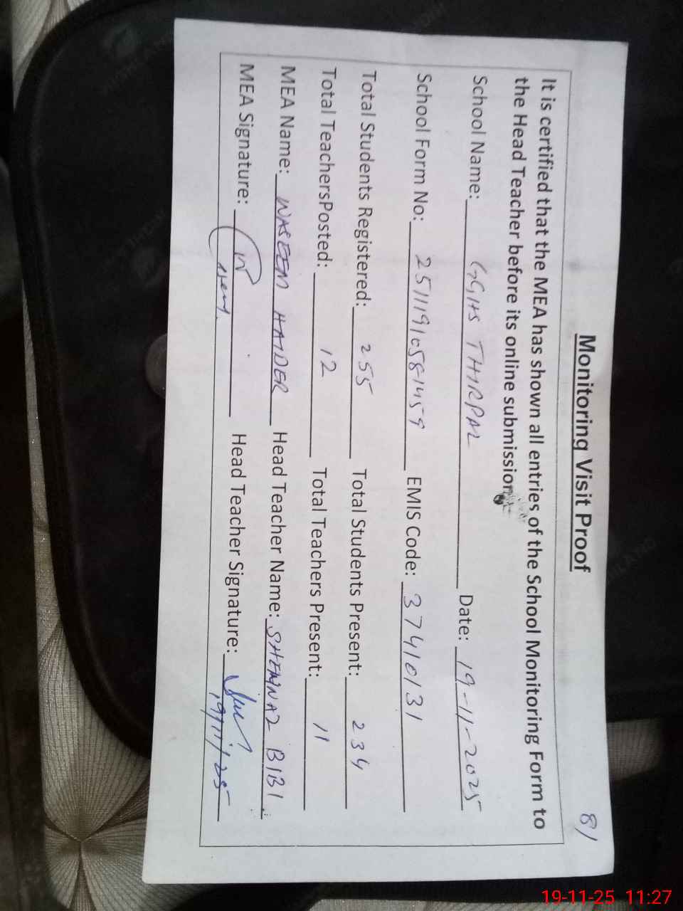 | Attendance Register | Head Teacher | MEA with School | Visit Proof |
