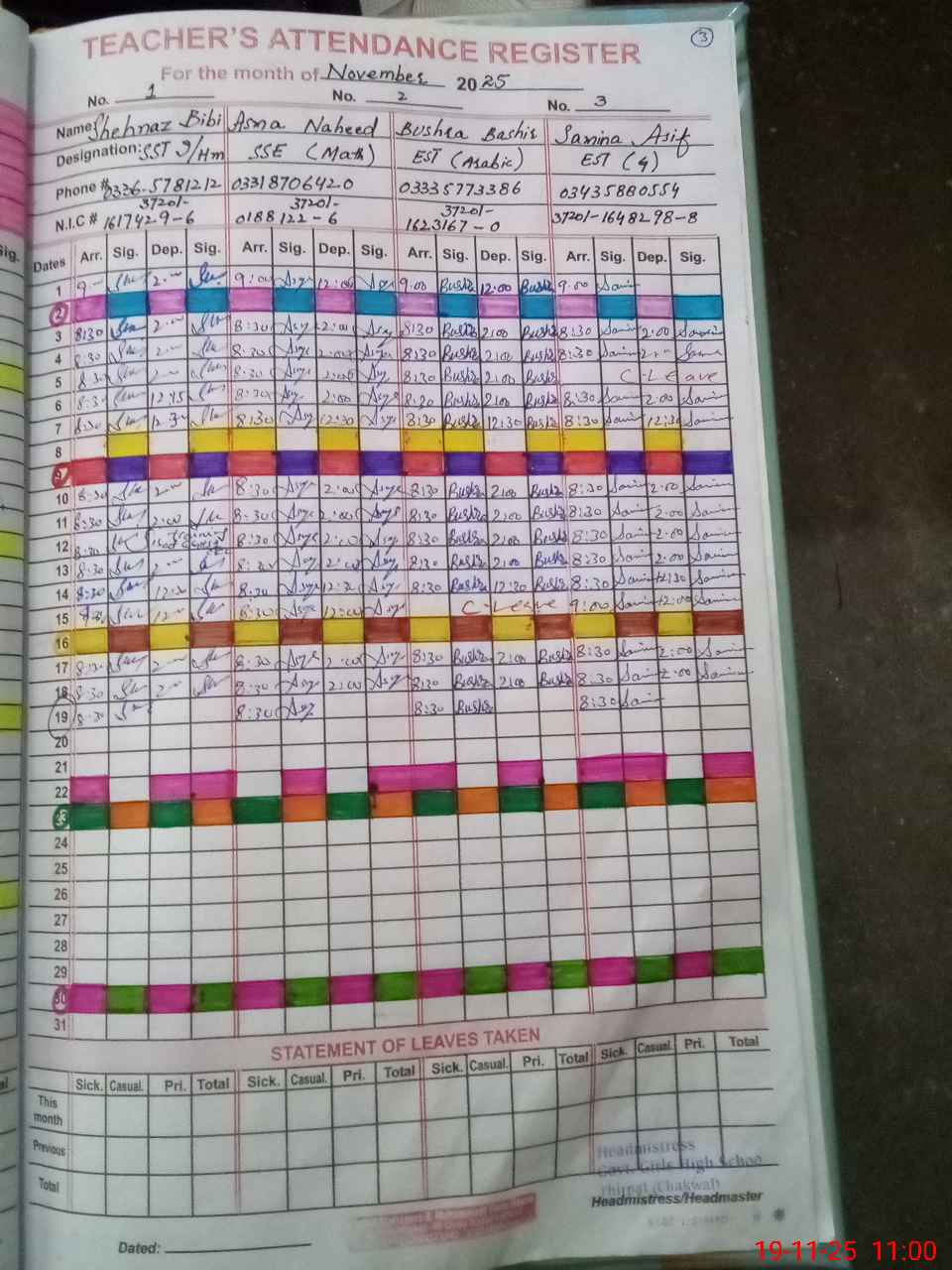 | CNIC | Full Name | Designation | R/C | Absence During Last Calender Month |