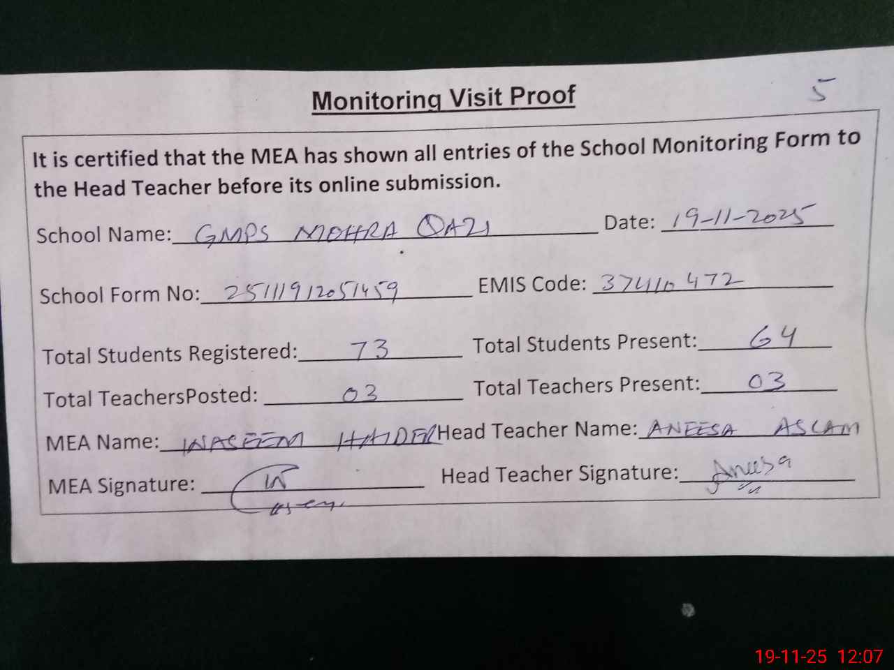 | EMIS Code: 37410472 | Name of School: GMPS MOHRA QAZI | |||