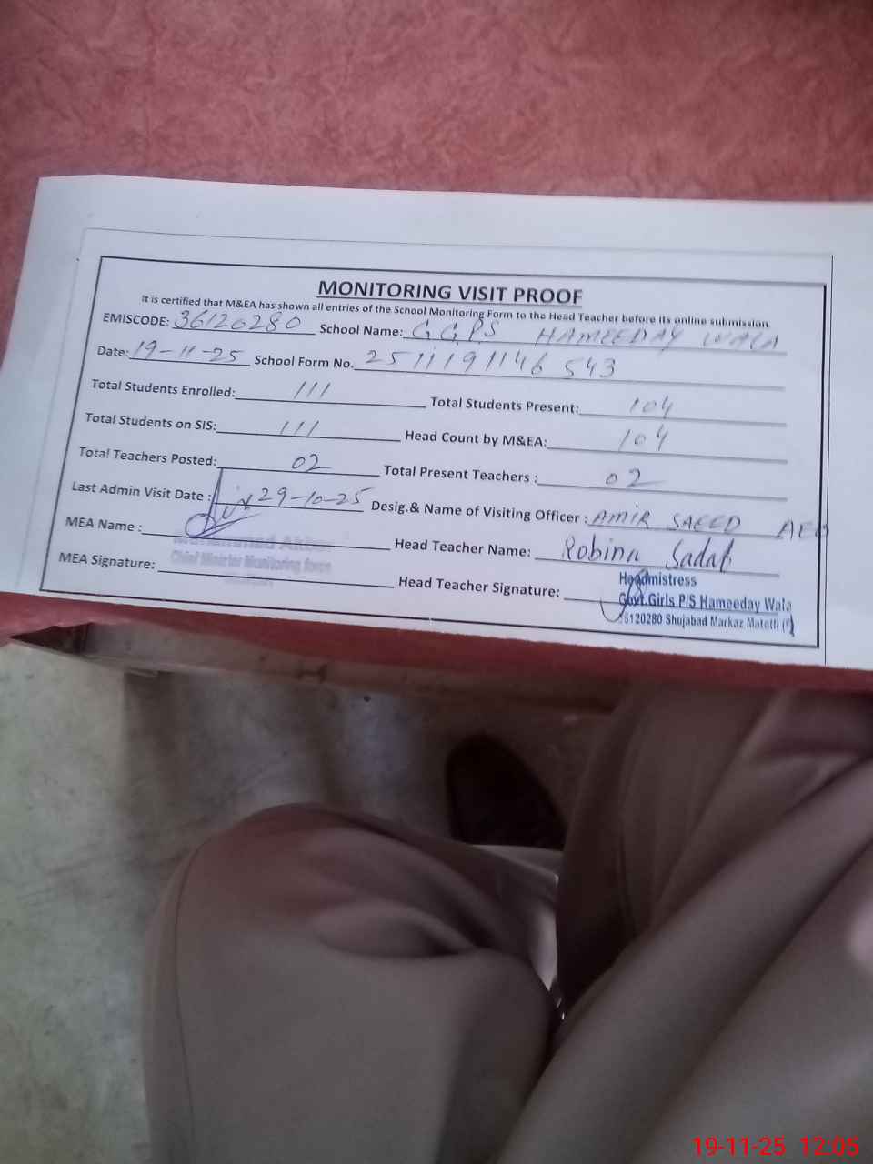 | Attendance Register | Head Teacher | MEA with School | Visit Proof |