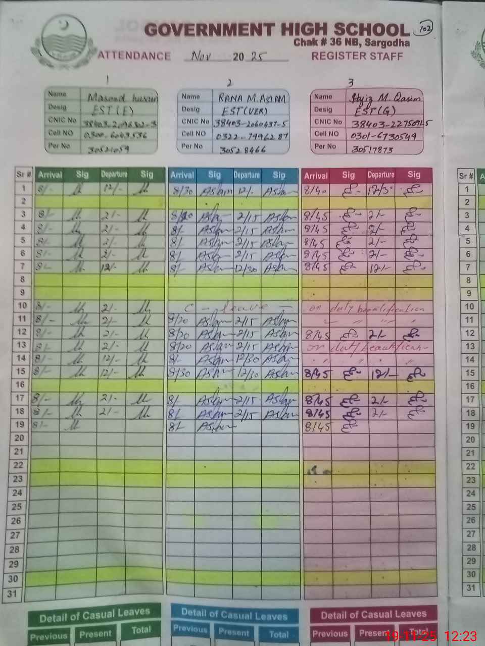 | CNIC | Full Name | Designation | R/C | Absence during last cal. month |