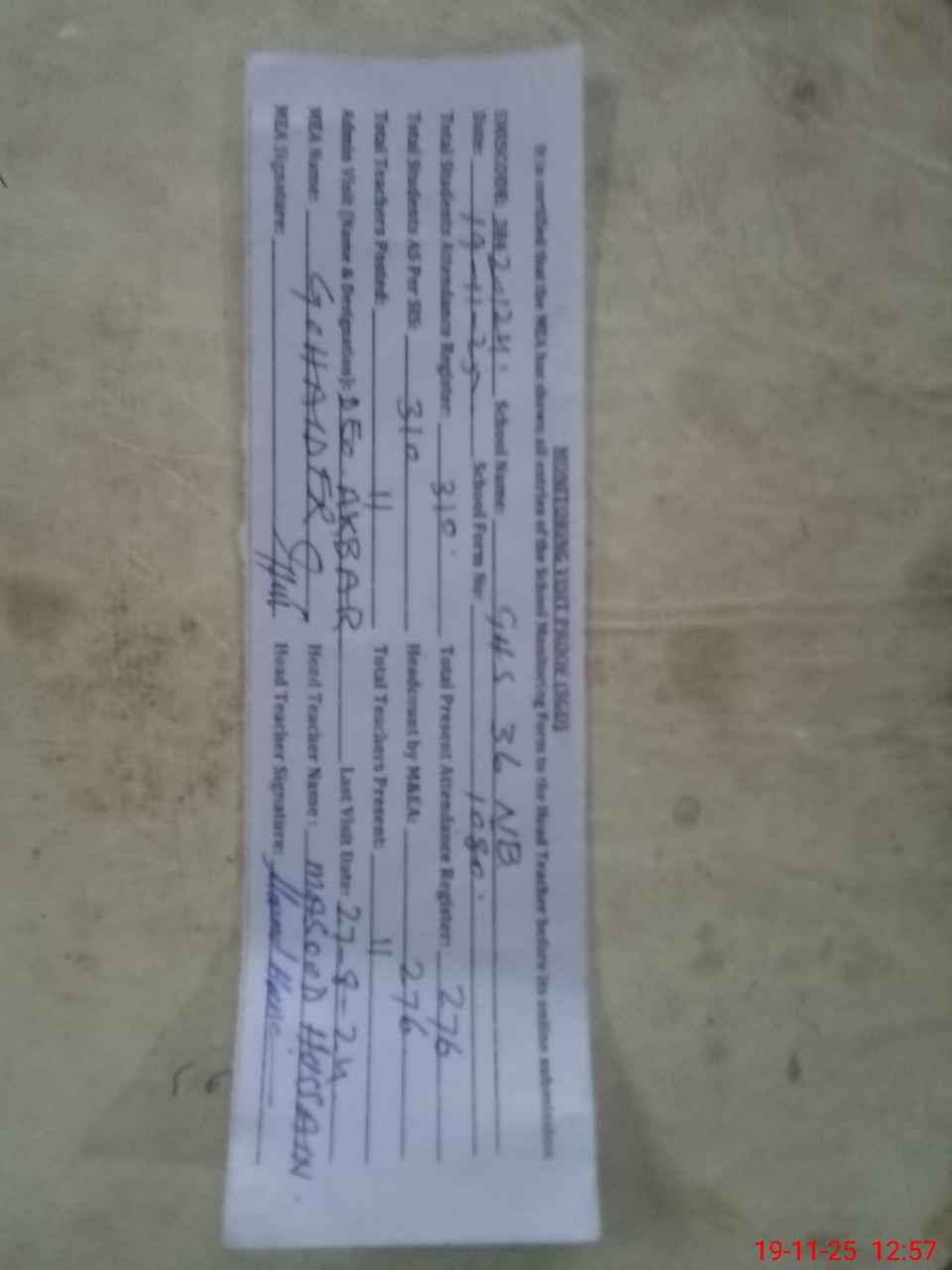 | Attendance Register | Head Teacher | MEA with School | Visit Proof |