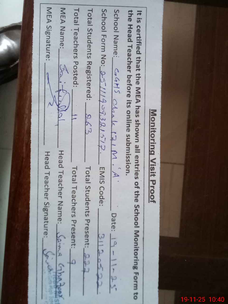| Certified that this School was Inspected by the Undersigned MEA/DMO Today and the Information Stated Above is as Per Record. | |||||