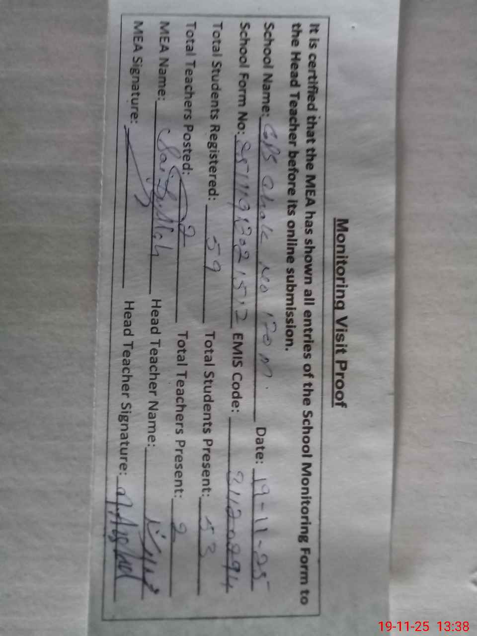 | Attendance Register | Head Teacher | MEA with School | Visit Proof |