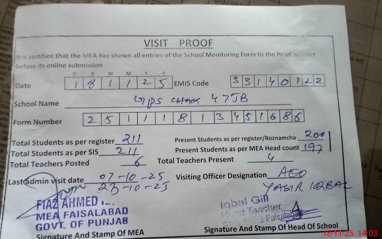 | Attendance Register | Head Teacher | MEA with School | Visit Proof |