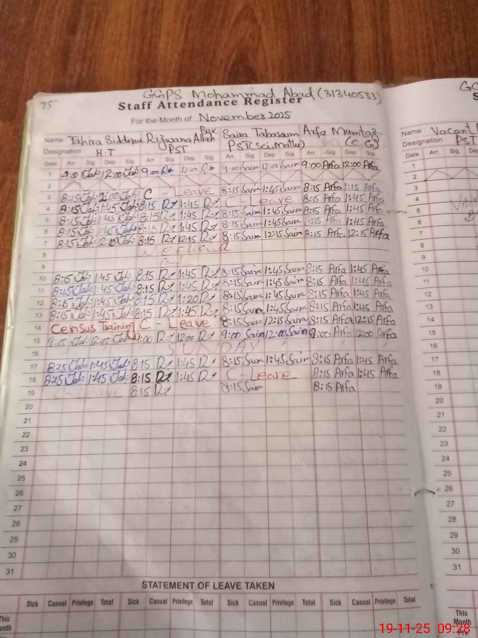 | Leave | Duty | Absent | Maternity | Medical | Ex- Pak |
