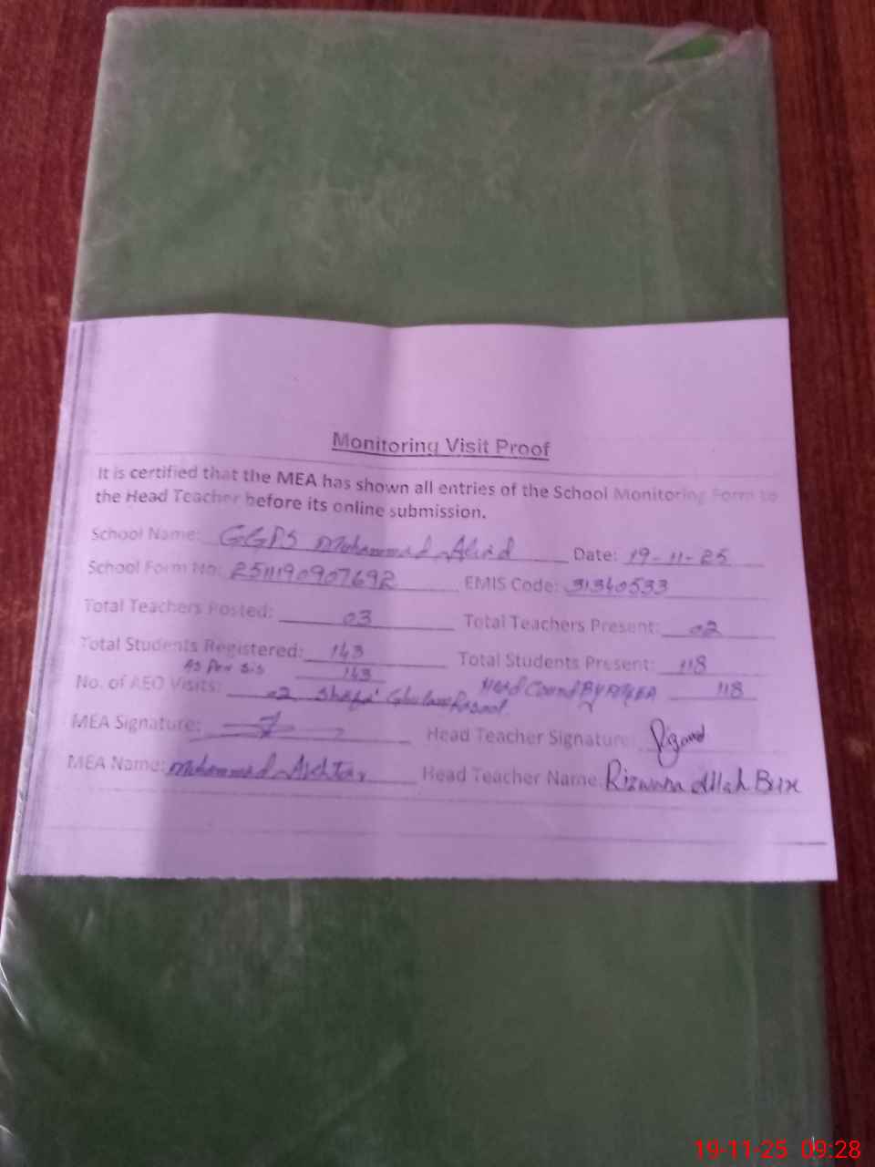 | Attendance Register | Head Teacher | MEA with School | Visit Proof |