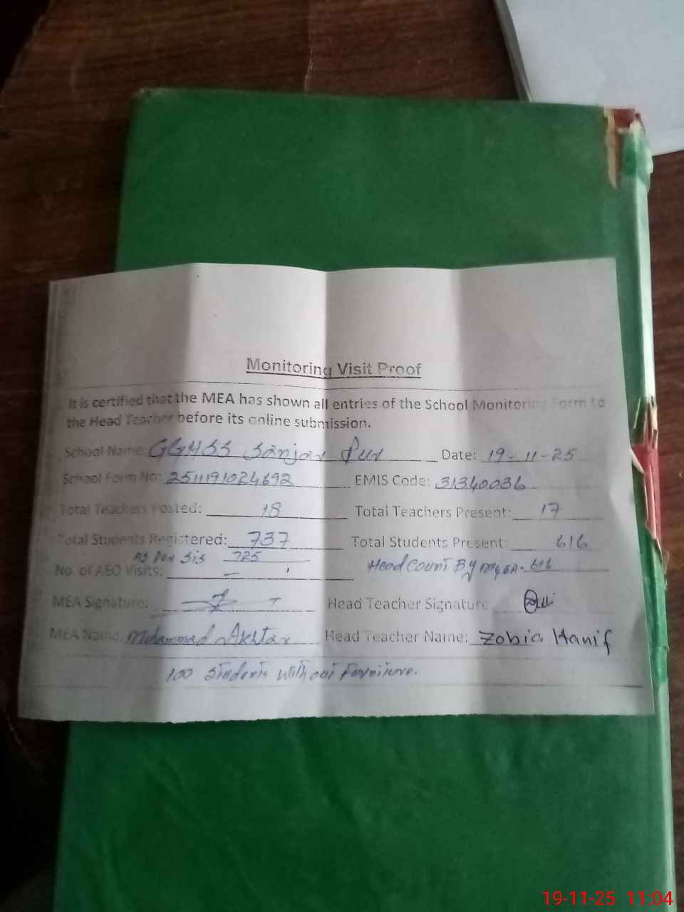 | Attendance Register | Head Teacher | MEA with School | Visit Proof |